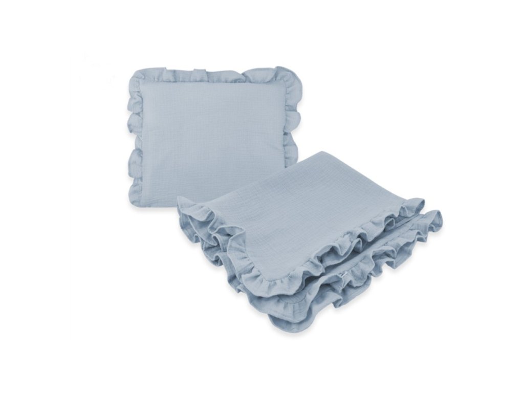 Tato sada zahrnuje měkoučkou deku s volánkem a polštářek s povlakem na zip, obojí vyrobené z prvotřídního bavlněného mušelínu.