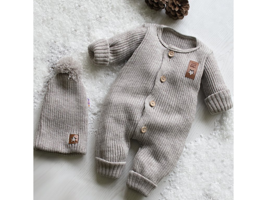 Baby Nellys 2-dílná sada Pletený overálek STAR + čepice Hand Made, béžový