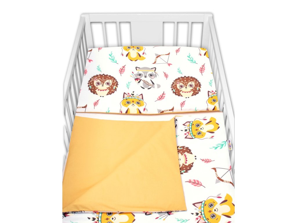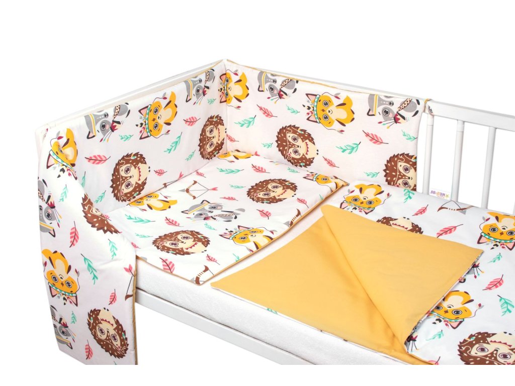 Baby Nellys 3-dílná sada Mantinel s povlečením-Ježek a Liška, bílá s potiskem/hořčicová