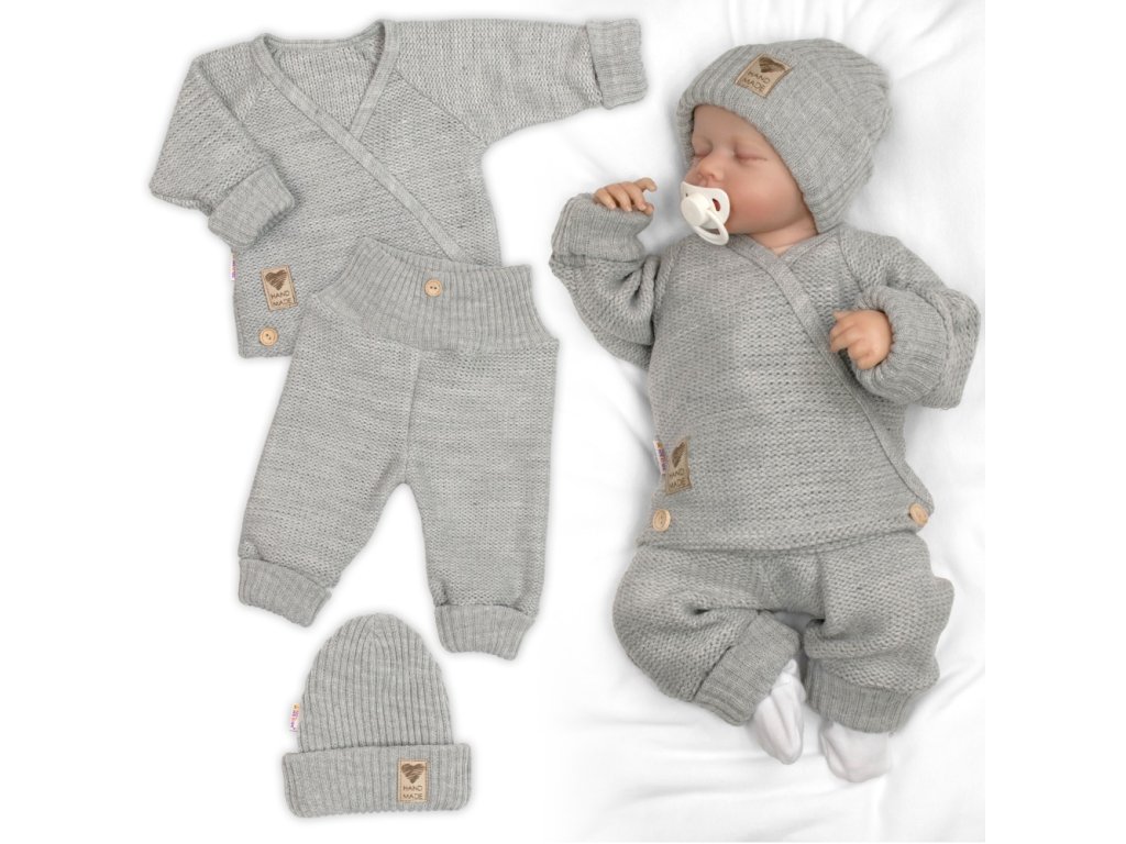 Rostoucí pletený zavinovací svetřík, kalhoty a čepice, 3D - šedá