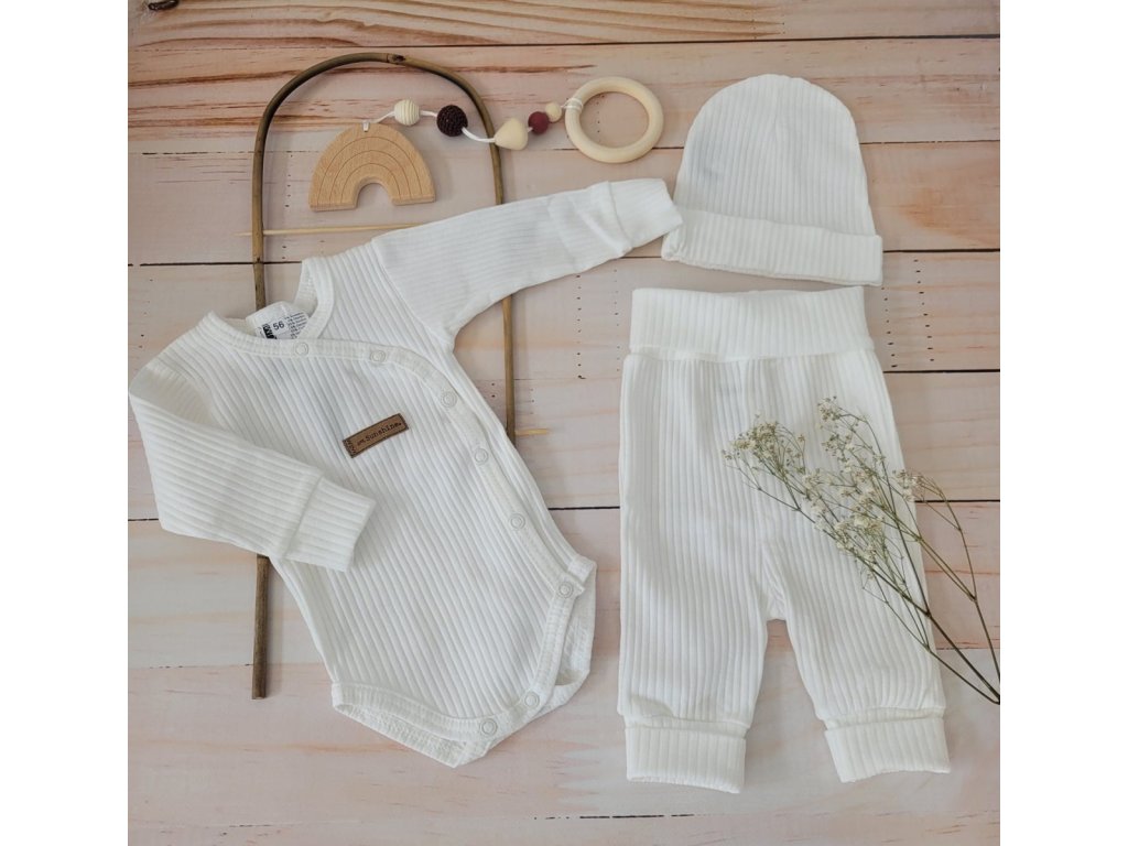 Žebrované zavinovací body, tepláčky a čepička Kazum 3D bavlněná sada, bílé