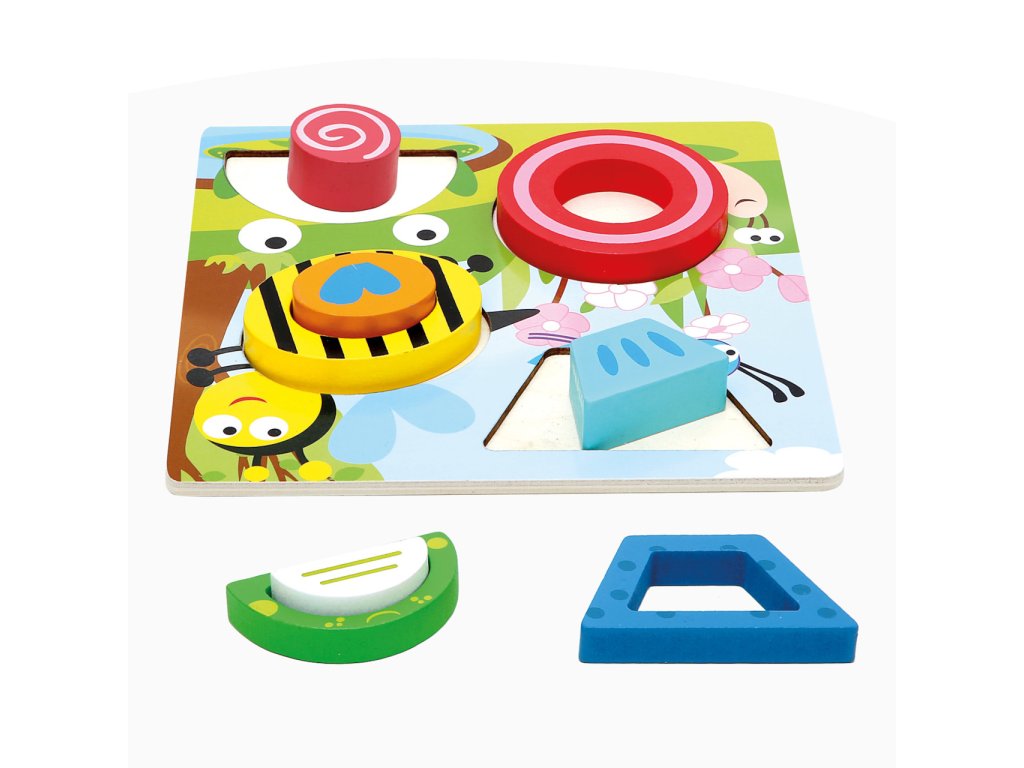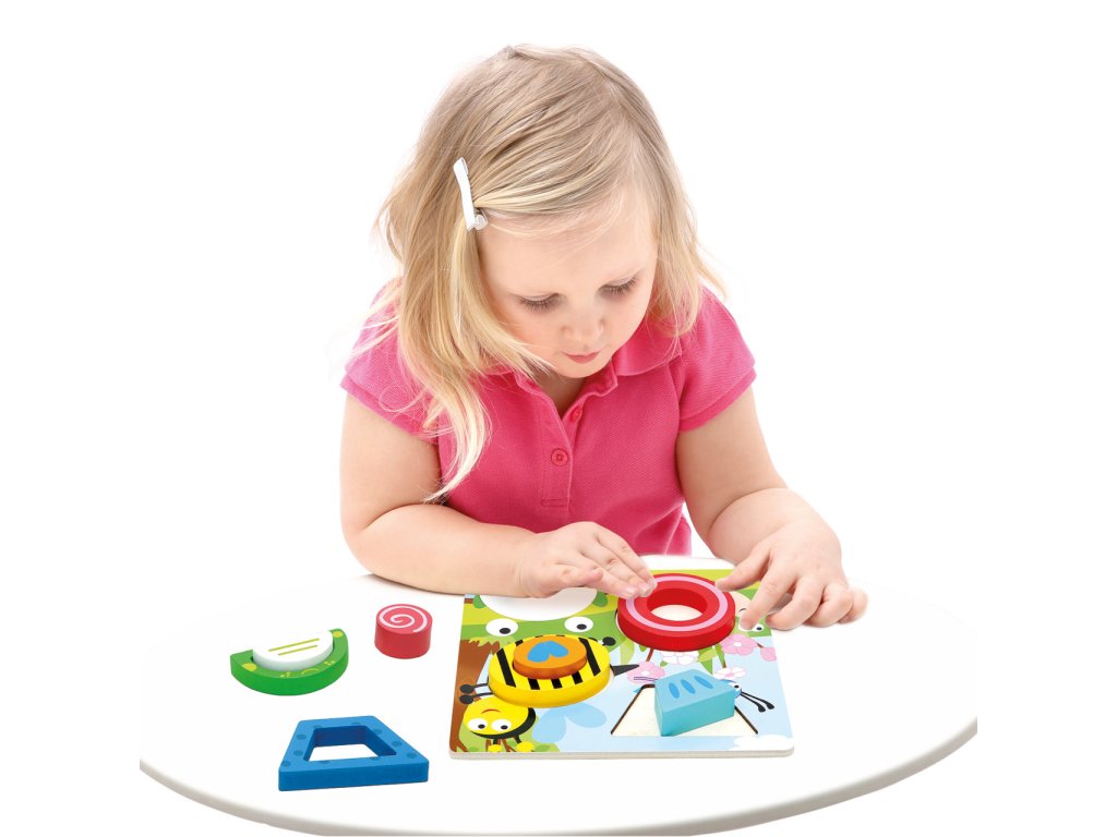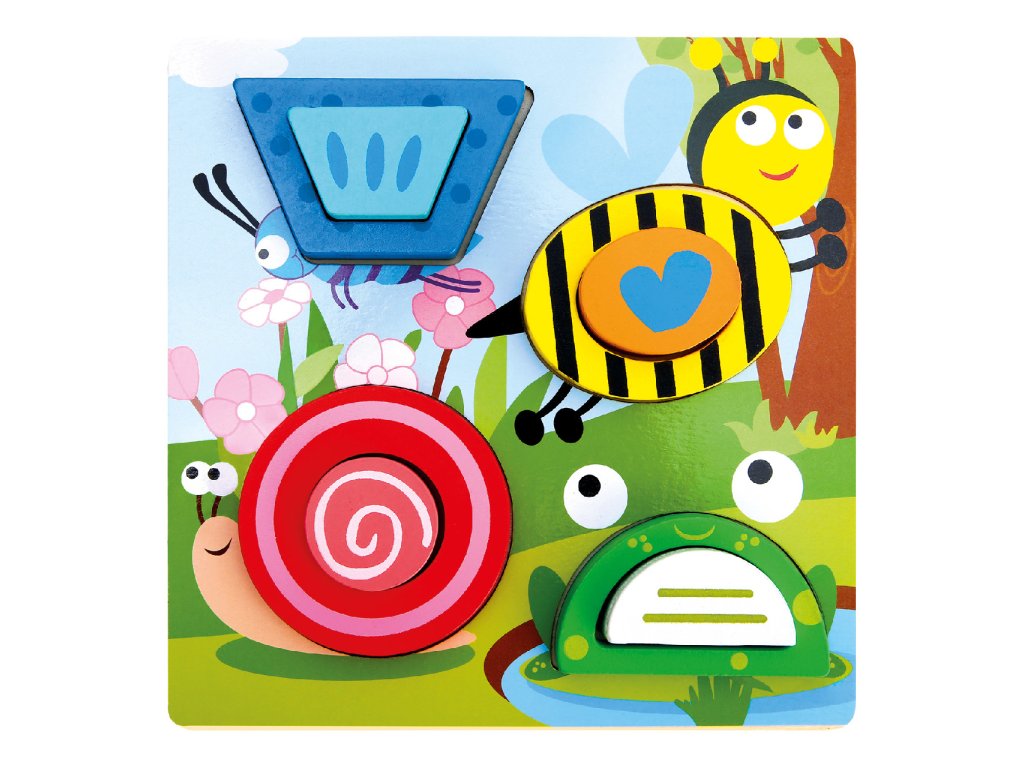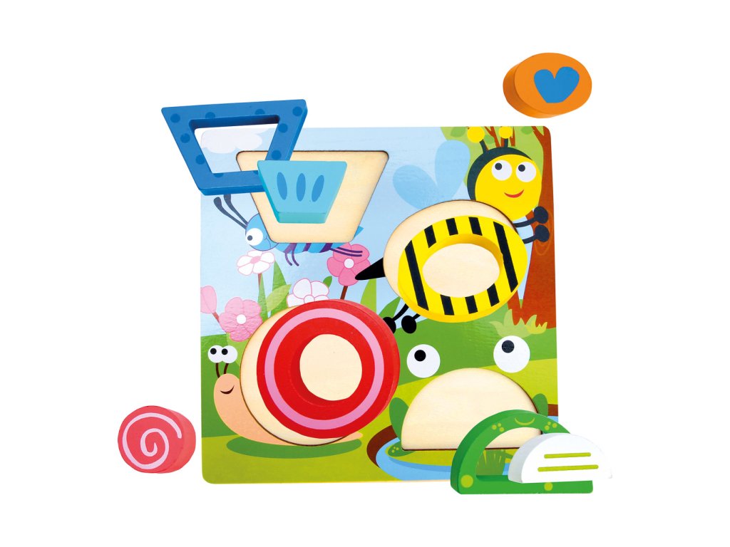 Prostorová vkládačka může Vašim dětem pomoci rozvíjet nejen rozpoznávání tvarů a jemnou motoriku, ale i chápat posloupnost. Prostřednictvím poutavých pestrobarevných motivů může také zábavně přispět k tréninku soustředění. Vyrobeno z masivního dřeva a silné překližky, ošetřeno nezávadnými barvami a laky.