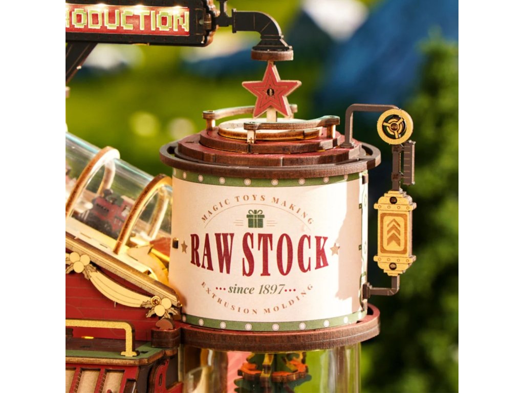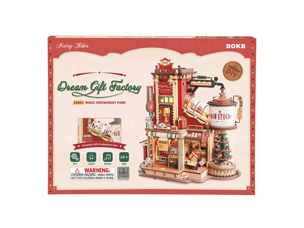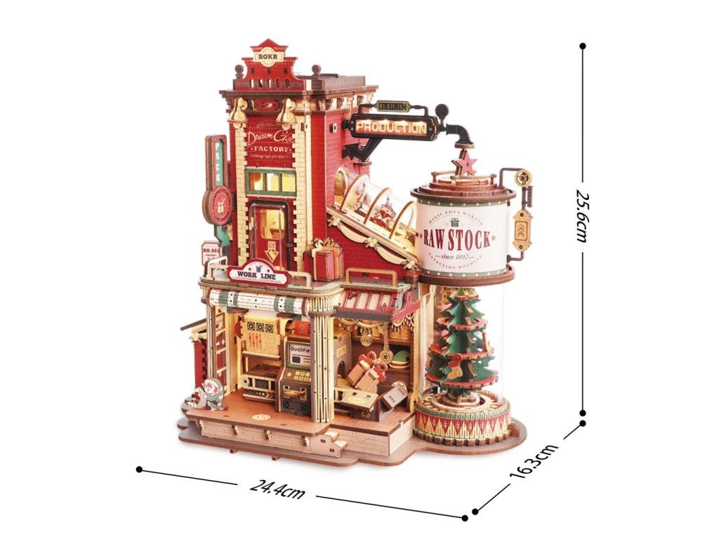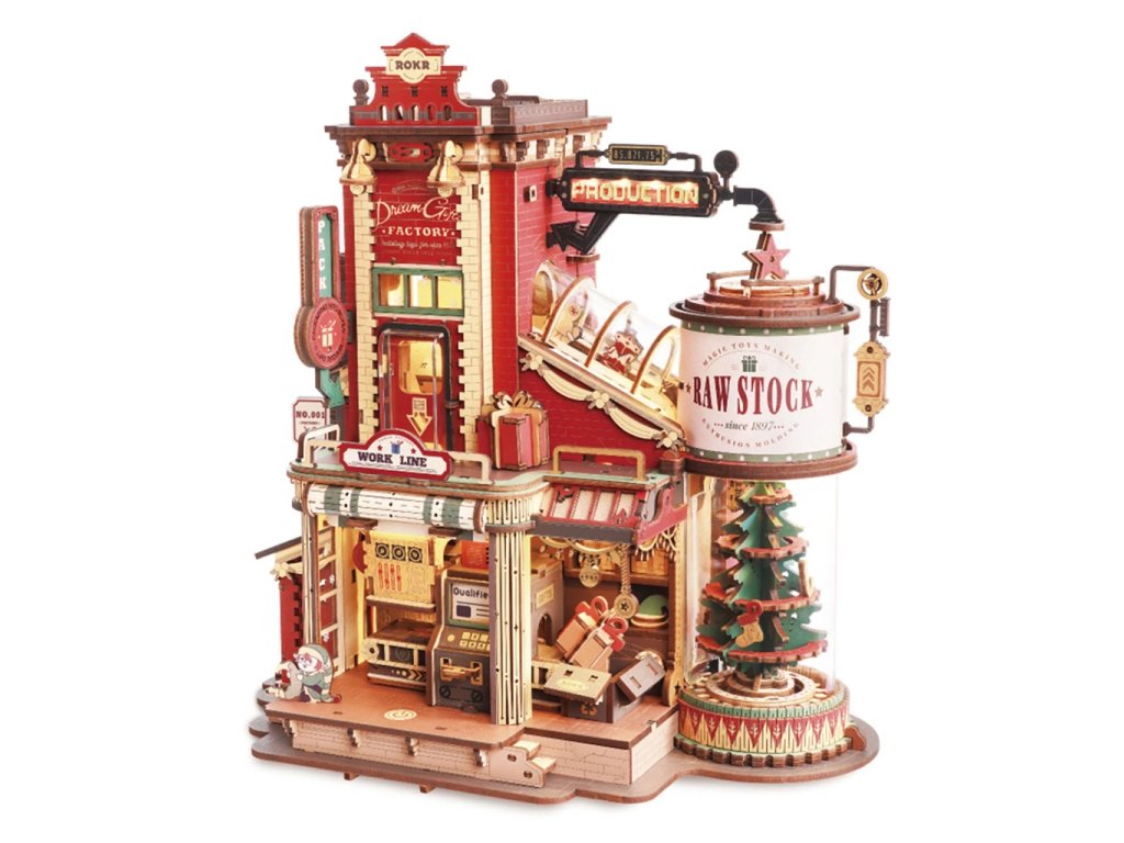 Roztomilá, hravá a plná detailů! Kouzelná továrna na dárky je dřevěná hrací skříňka a skládačka v jednom, která přehrává veselou melodii a přitom ukazuje zázračný proces výroby dokonalých dárků v Santově tajné dílně. Přemýšleli jste někdy, jak se vyrábějí ty nejkrásnější dárky? Díky této továrně se to dozvíte i Vy! Vidíte celý proces od zpracování surovin, přes sestavení a balení až po uvázání mašle a výstupní kontrolu radosti.