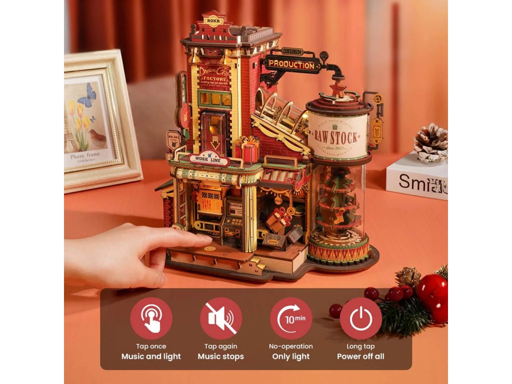 Po spuštění se roztočí ozubená kola, rozsvítí se šest různých světelných efektů a dárky začnou cestovat z věže se surovinami po dopravníku do balicí části ve druhém patře. Odtud pokračují do přízemí, kde jsou ozdobeny mašličkou a připraveny pro své šťastné příjemce. Celý proces ožívá za doprovodu příjemné melodie, kterou snadno ovládáte jedním tlačítkem, můžete zapnout či vypnout zvuk i světla, dlouhým stiskem vypnete vše. Barevné zpracování ve stylu vintage dodává hrací skříňce hravý a poutavý vzhled.