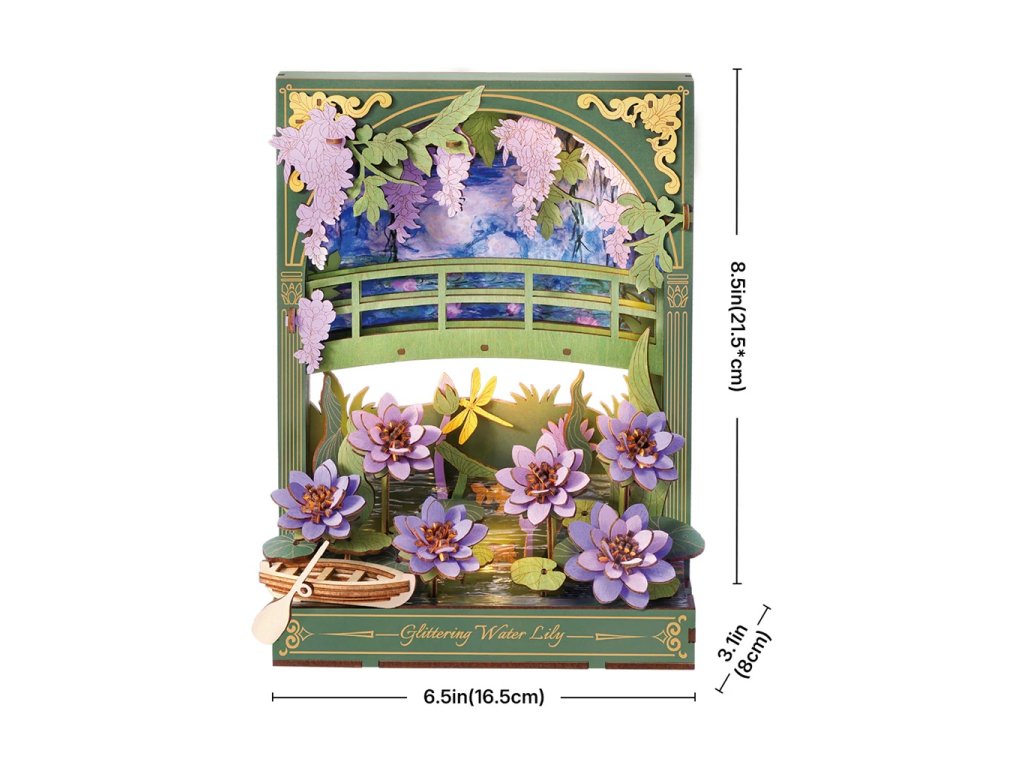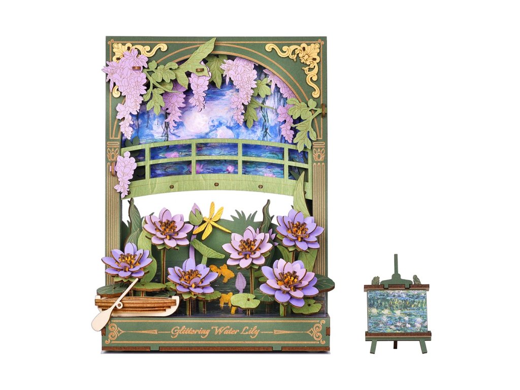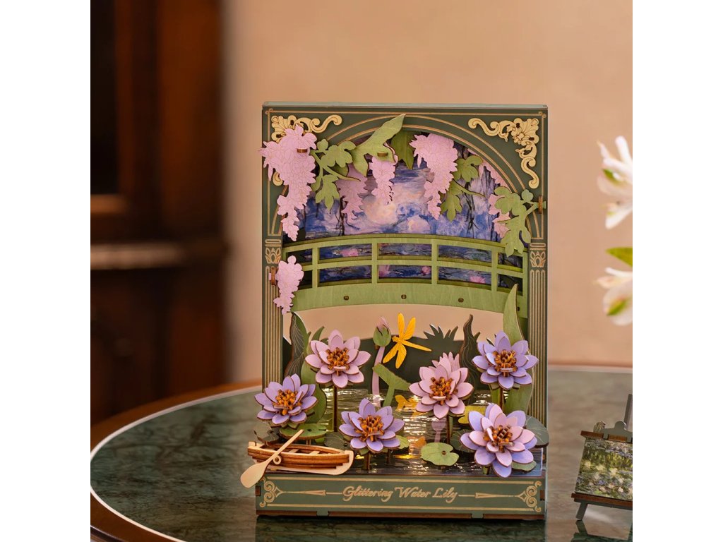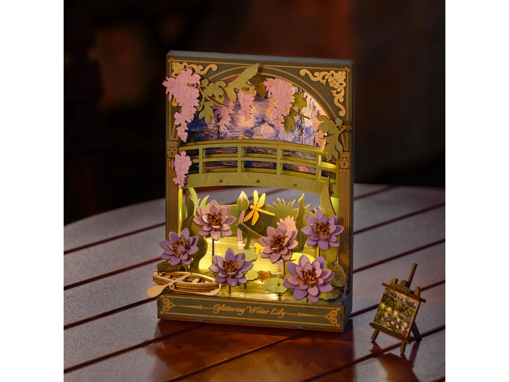 Užijte si netradiční ztvárnění klasických Monetových maleb prostřednictvím 3D skládačky. Třpytivé lekníny vytvoří po sestavení kouzelnou dekoraci s příjemným teplým osvětlením, která ozdobí každý interiér. Celá scenérie s detailně propracovanými květinami, loďkou a dřevěným můstkem navodí atmosféru klidu a pohody. Decentní LED podsvícení dodává dekoraci magickou atmosféru a připomíná hru světla při západu slunce, tolik typickou pro Monetova díla. Složenou scenérii můžete využít jako noční světlo, doplněk do knihovny nebo originální dárek pro každého, kdo má rád umění a tvoření.