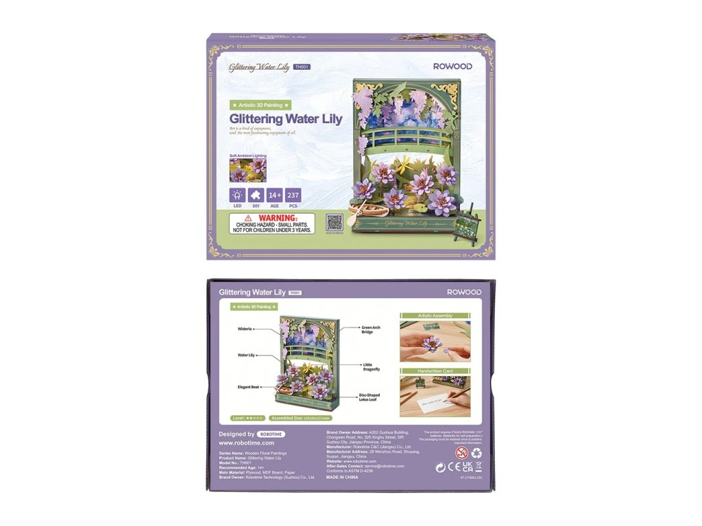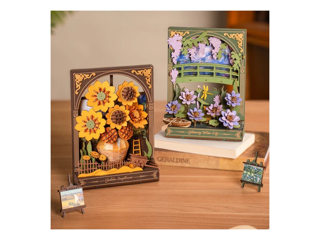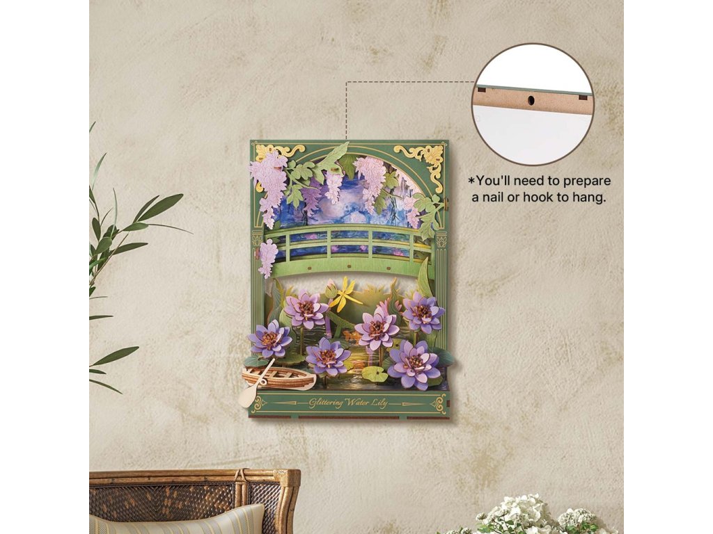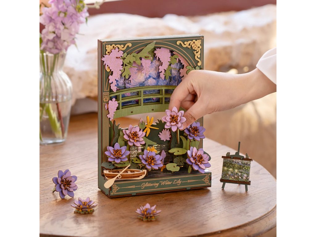 Užijte si netradiční ztvárnění klasických Monetových maleb prostřednictvím 3D skládačky. Třpytivé lekníny vytvoří po sestavení kouzelnou dekoraci s příjemným teplým osvětlením, která ozdobí každý interiér. Celá scenérie s detailně propracovanými květinami, loďkou a dřevěným můstkem navodí atmosféru klidu a pohody. Decentní LED podsvícení dodává dekoraci magickou atmosféru a připomíná hru světla při západu slunce, tolik typickou pro Monetova díla. Složenou scenérii můžete využít jako noční světlo, doplněk do knihovny nebo originální dárek pro každého, kdo má rád umění a tvoření.