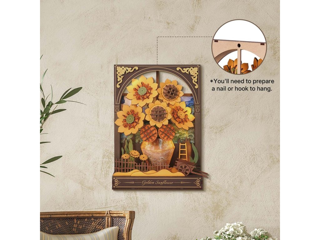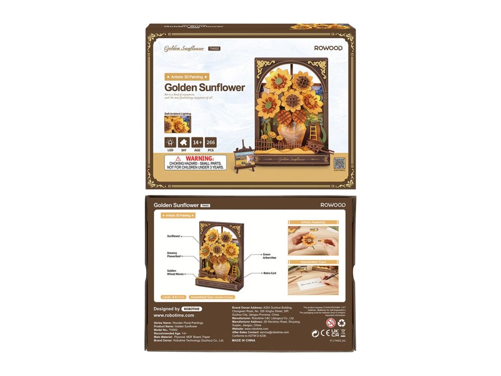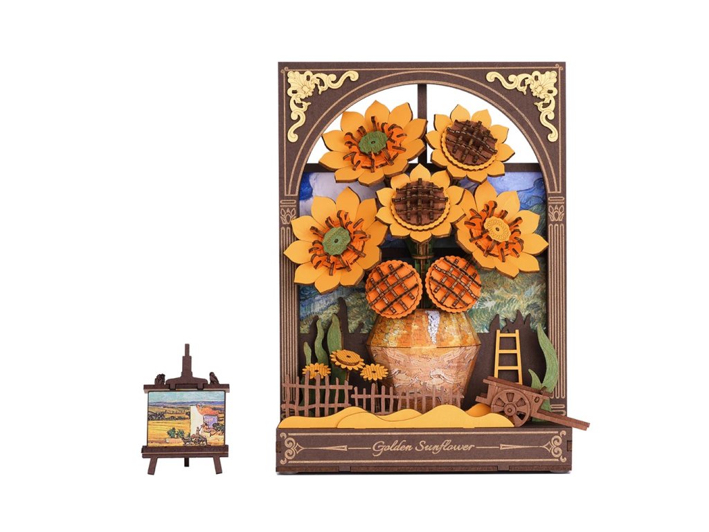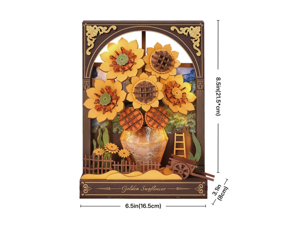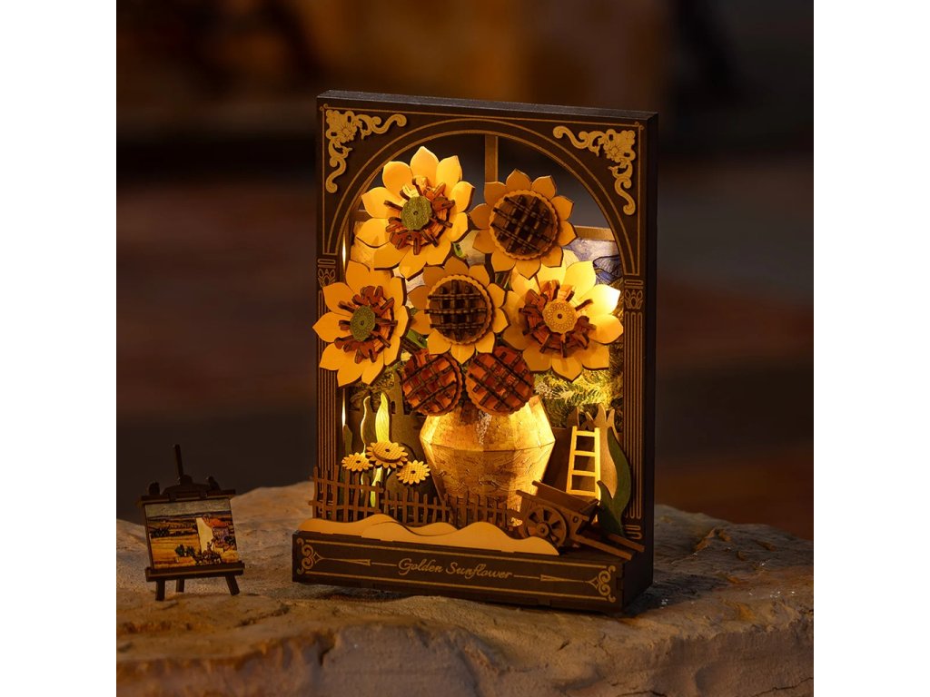 3D skládačka Zlaté slunečnice vytvoří po sestavení kouzelnou dekoraci s jemným osvětlením, která ozdobí každý interiér. Celá scenérie vnese do Vašeho domova pozitivní náladu a pohodu i díky příjemnému LED podsvícení v teplých tónech. Složenou scenérii můžete využít jako noční světlo, doplněk do knihovny nebo originální dárek pro každého, kdo má rád umění a tvoření. Součástí je i mini stojánek, který doplní atmosféru tohoto uměleckého díla.