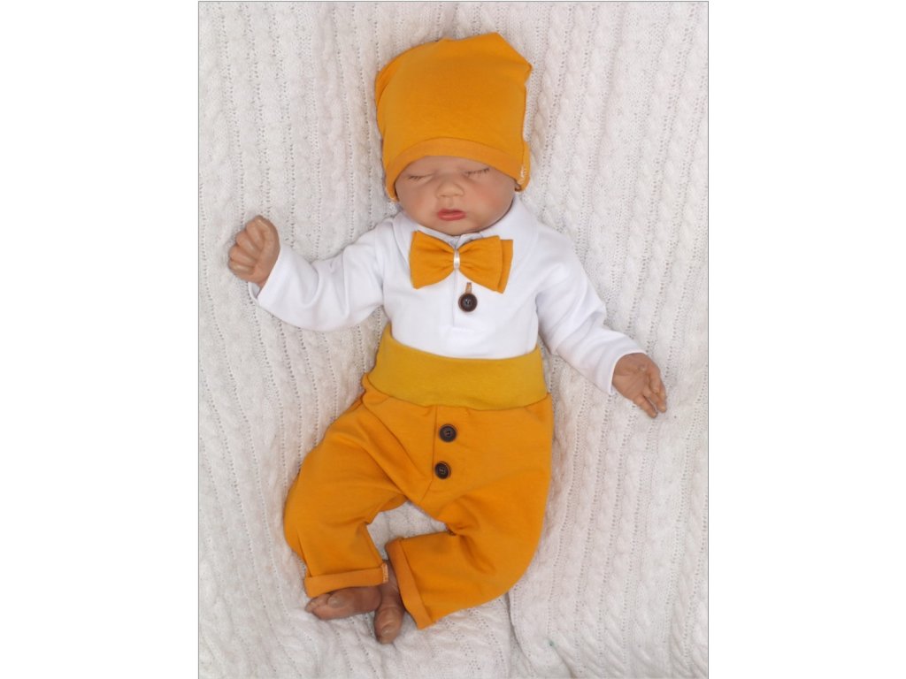 Bavlněná soupravička body, tepláčky, čepička a motýlek 4D, Z&Z, bílá/hořčicová