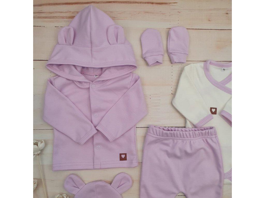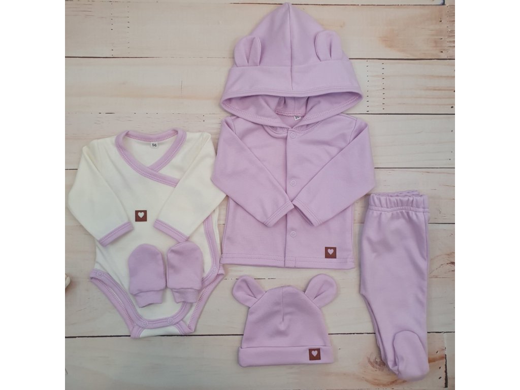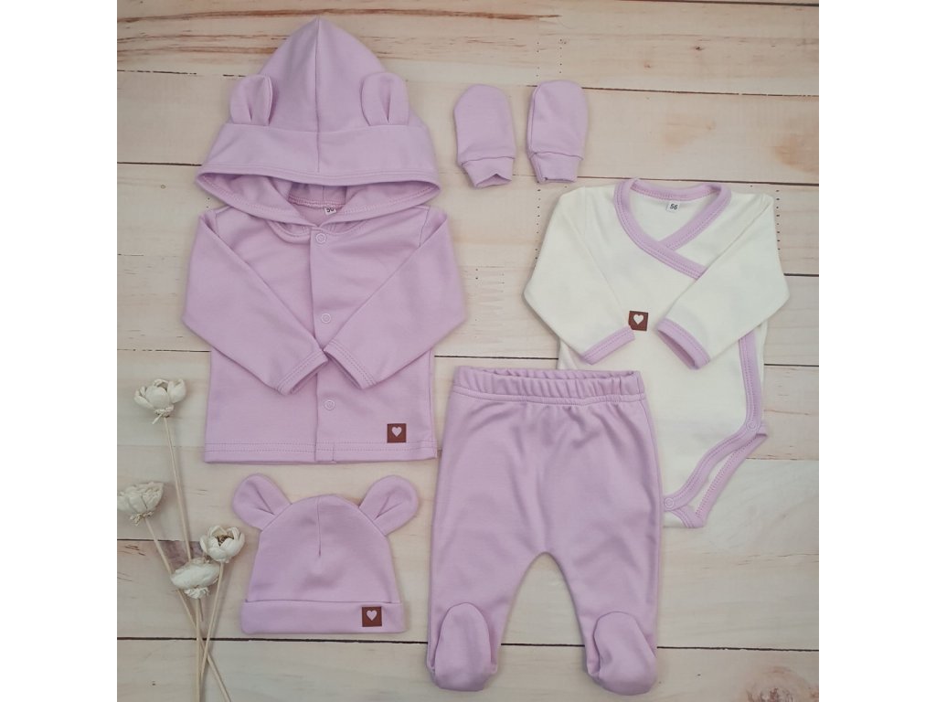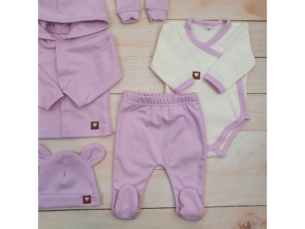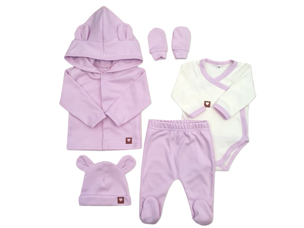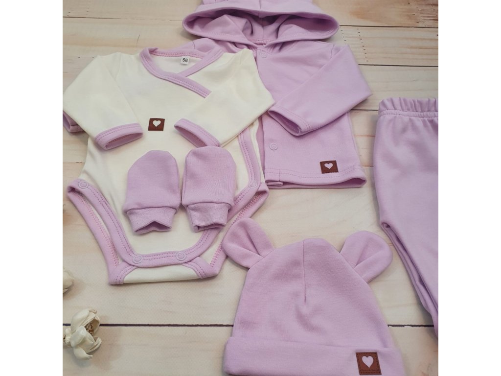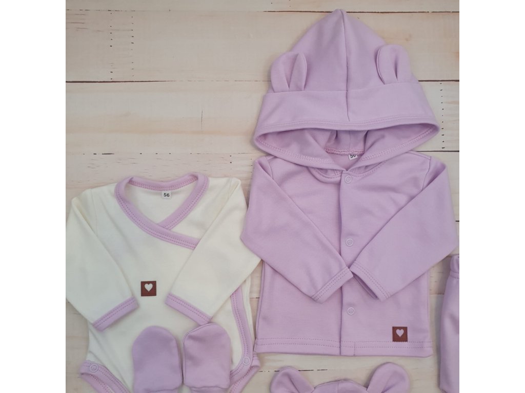Sada do porodnice 5D, body, polodupačky, kabátek, čepička, rukavičky, lila