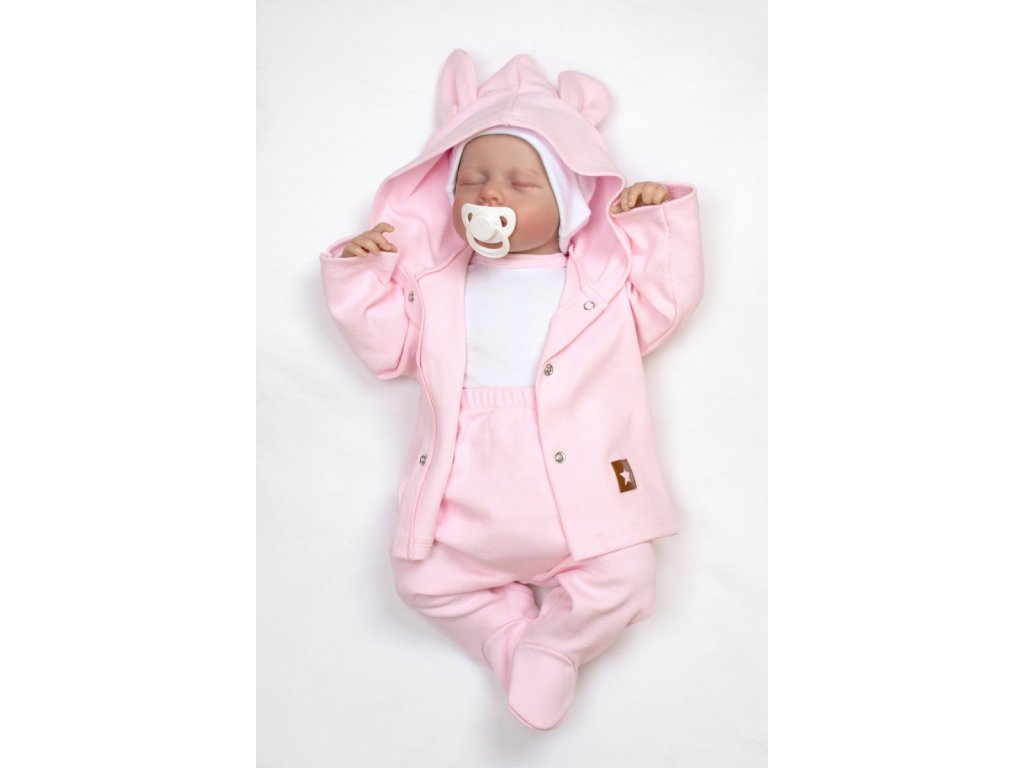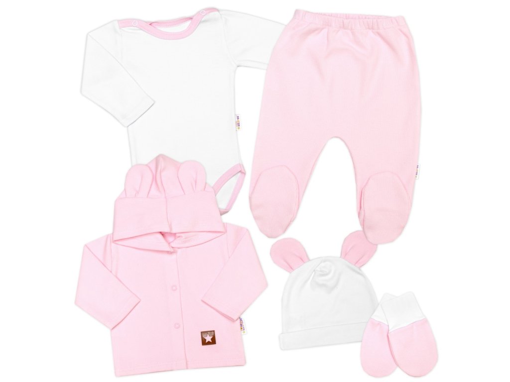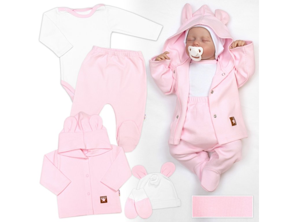 Žebrovaná sada, Star 5D, body, polodupačky, kabátek, čepička, rukavice - růžová, bílá