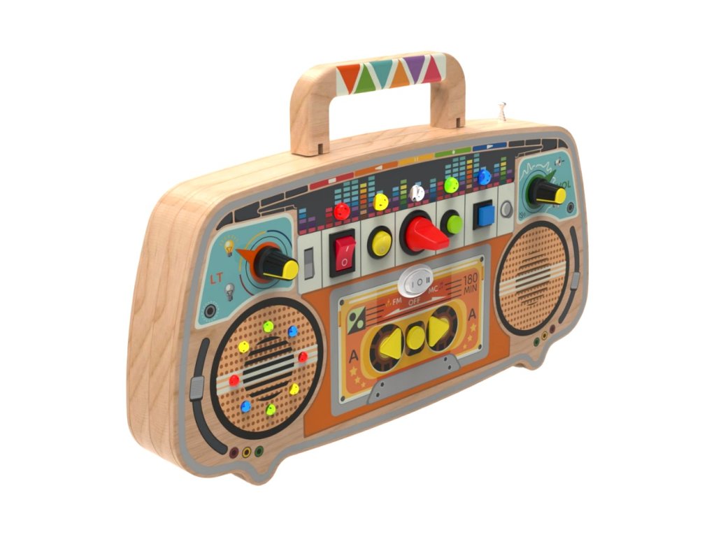 Tento originální dřevěný activity board ve stylu retro rádia je navržen pro malé objevitele, kteří si rádi hrají a zároveň se učí. Díky senzorickému LED panelu s barevnými světýlky a svítícími tlačítky okamžitě upoutá pozornost nejmenších dětí. Hravým způsobem podporuje rozvoj koordinace pohybu, vnímání barev i reakce na vizuální a hmatové podněty. Chytře navržená kombinace interaktivních prvků – otočné knoflíky, přepínače, posuvníky a stylizované „reproduktory“ s barevnými cvočky – pomáhají dětem rozvíjet jemnou motoriku, smyslové vnímání a kreativitu. Součástí je také kazetový přehrávač s tlačítky na mačkání a praktické dřevěné madlo, které usnadňuje přenášení hračky.
