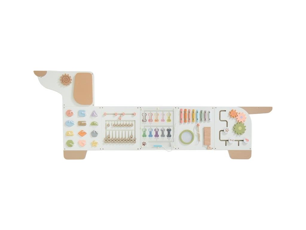 Po celé délce „tělíčka“ pejska děti najdou více než deset různorodých herních prvků – otočná a ozubená kolečka, xylofon, barevné otevírací geometrické tvary, bludiště, počítadlo, zrcátko, hmatové a motorické dráhy, třídění barevných kuliček podle počtu pomocí magnetického pera a další hravé detaily.Každý herní prvek je navržen tak, aby podporoval dětskou zvídavost, procvičoval jemnou motoriku, koordinaci pohybů i smyslové vnímání – a to vše přirozeně, hravou formou