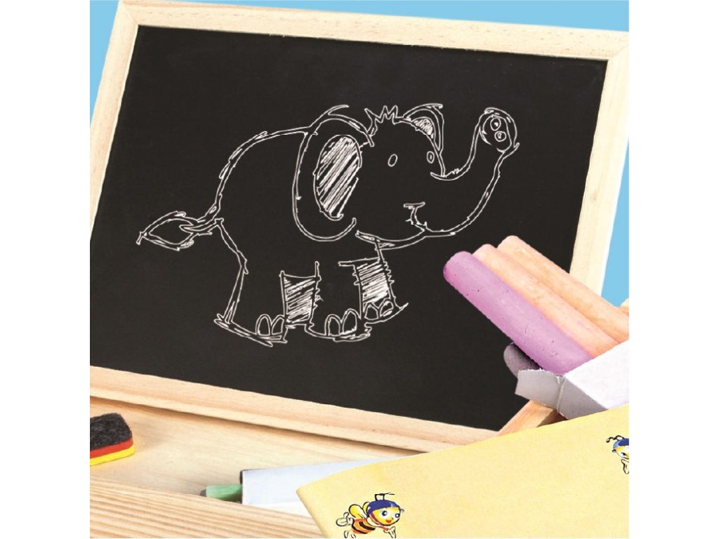 Obsah balení: oboustranná tabulka v dřevěném boxu, 3 křídy, fix s plstěnou houbičkou, magnetky, předloha