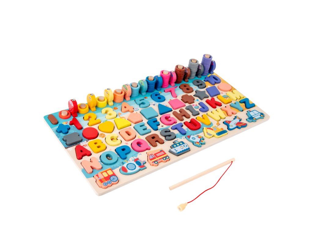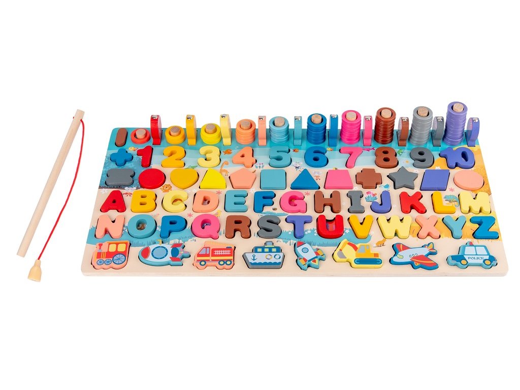 Každý malý šikula si najde to své! Dřevěná multifunkční deska nabízí edukativní hru a pomáhá dětem v koordinaci motoriky, zlepšování koncentrace a rozvoji logického myšlení. Jejím cílem je nejen učení přeměnit na zábavu, ale také vyvinout k učení u nejmenších kladný vztah. Vedle rozpoznávání čísel, tvarů a barev lze v této hře "rybařit" či stohovat kroužky na sebe. Všechny části dřevěné skládačky jsou dimenzovány tak, aby byly ideální pro drobné dětské ruce.