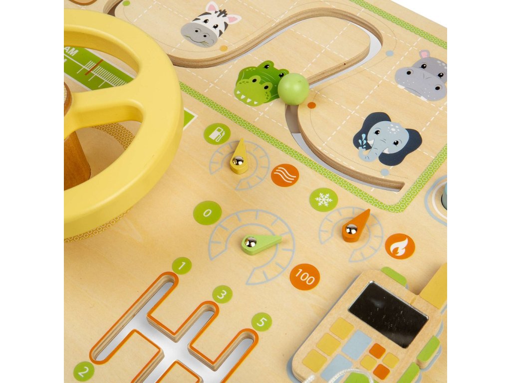 Tato pestrobarevná hrací deska s roztomilými zvířátky přináší spoustu zábavy, díky které bude moci Vaše dítě rozvíjet zručnost, zvídavost a jemnou motoriku. Různé aktivity jako je mačkání tlačítek, labyrint, ozubená kolečka, otáčecí a posuvné destičky a další dávají dítěti možnost procvičovat jemnou motoriku, koordinaci ruka-oko, dovednost při řešení problémů a porozuměním příčině a následku. Pestré barvy, roztomilé obrázky a spousta aktivit stimulují smyslové vnímaní dětí. Deska je vyrobena z prvotřídního dřeva s certifikací FSC a barvena netoxickými barvami a laky. Vyhovuje aktuálním evropským bezpečnostním normám.