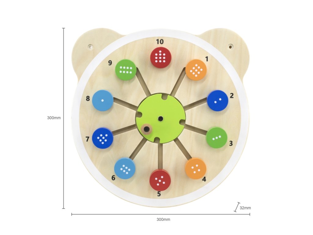 Tato skvělá nová řada hraček na zeď je ideální pro nejmenší, roztomilá sada hraček s hlavou medvěda je navržena tak, aby procvičovala schopnost dětí rozpoznávat barvy, digitální kognitivní schopnosti, koordinaci rukou a očí a logické myšlení. Přesuňte kulaté zářivě barevné dřevěné kostky tak, aby odpovídaly odpovídajícím číslům na panelu. Rozměry 30x30x3,2 cm. Rozměry balení cca 31x31x4 cm. Věk 18m+Doplňkové parametry
