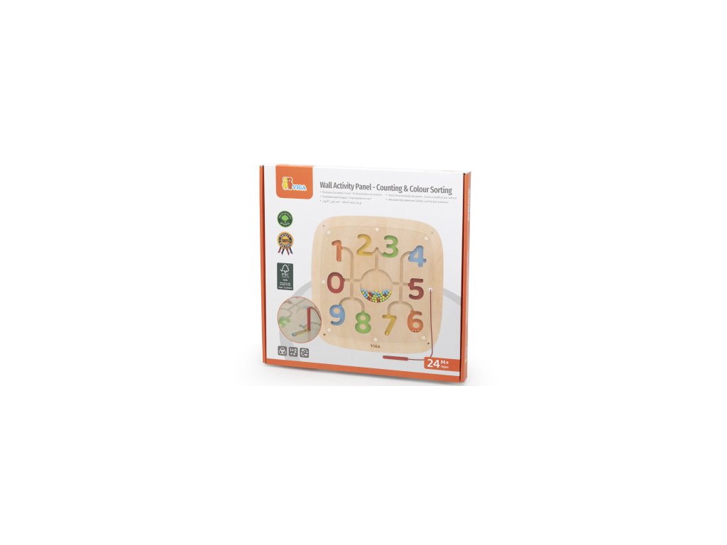 Dřevěný nástěnný panel - počítání a barvy. Tento nástěnný panel s aktivitami promění rozpoznávání barev a čísel v praktické dobrodružství. Pomocí magnetického pera děti navádějí korálky po kolejnicích do odpovídajících barevných/číselných políček – tím si zábavnou a interaktivní hrou rozvíjejí rané dovednosti v počítání, rozpoznávání barev a jemnou motoriku. Rozměry panelu 40x40x2 cm. Rozměry balení 41x41x4 cm. Věk 24m+Doplňkové parametry
