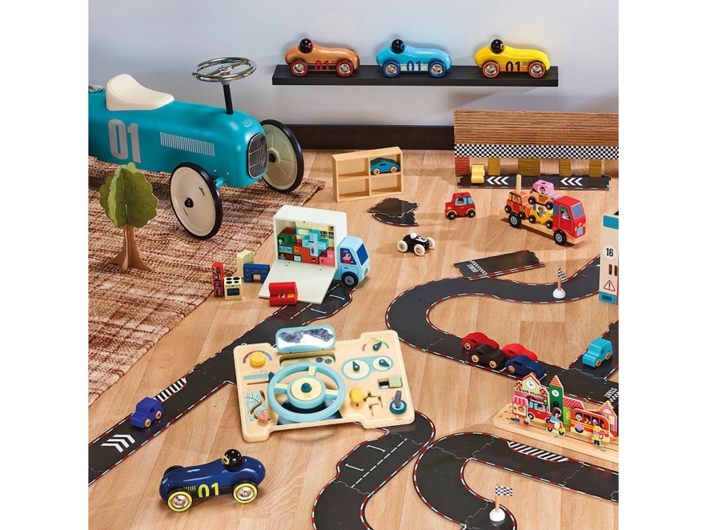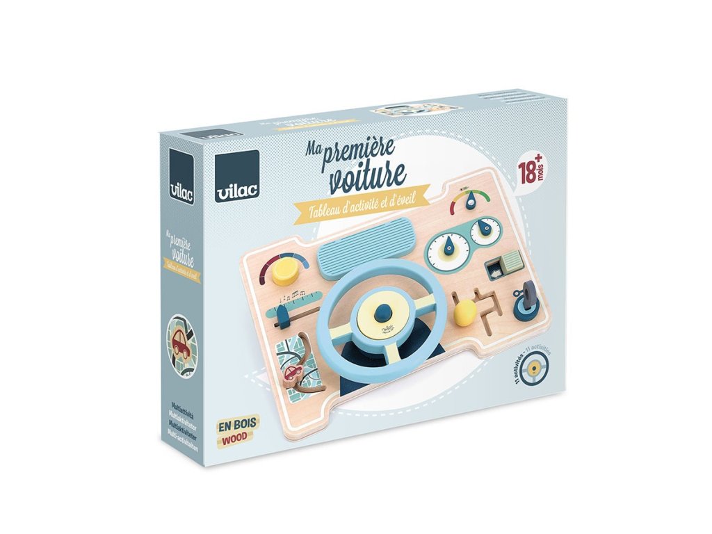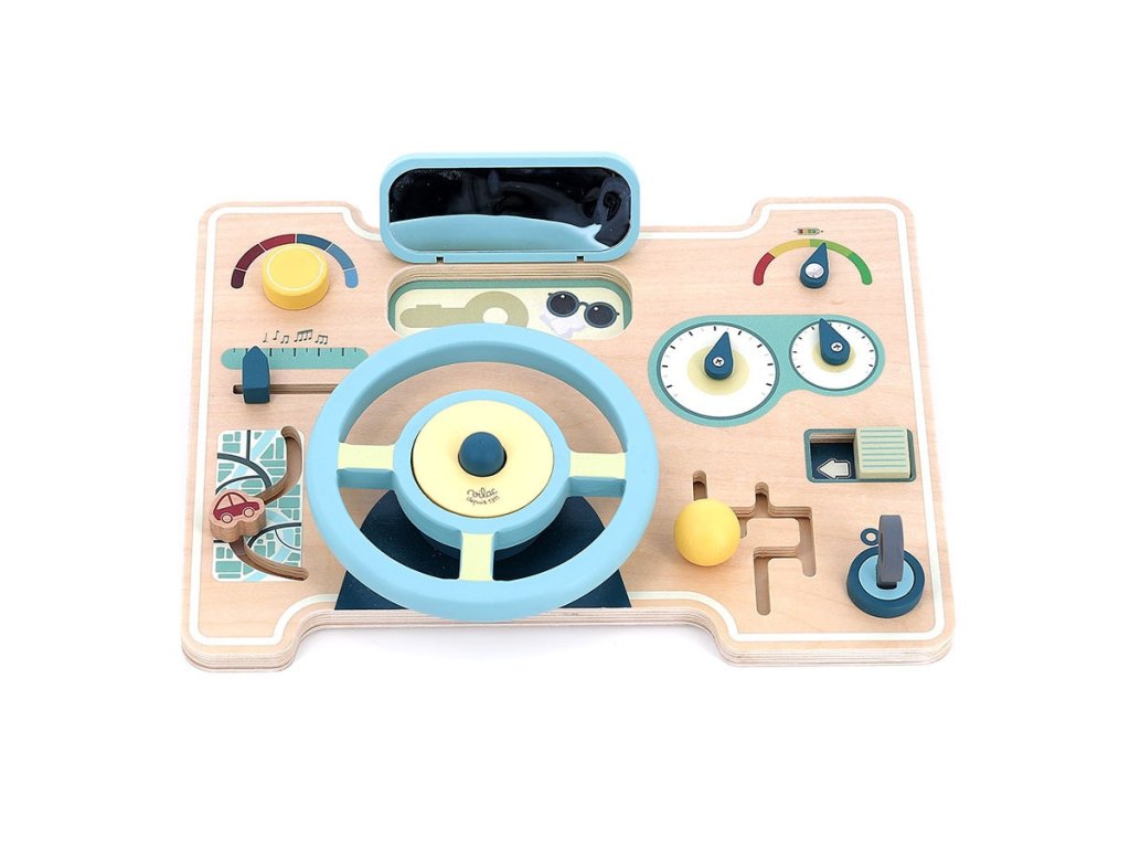 Jsi připraven vyrazit? Stačí nasednout, chytit volant a už se jede! Tato dřevěná palubní deska s množstvím interaktivních prvků zve děti ke hře na řidiče – přesně jako dospělíVolant se otáčí, řadicí páka cvaká, GPS ukazuje směr a palivoměr hlídá stav nádrže