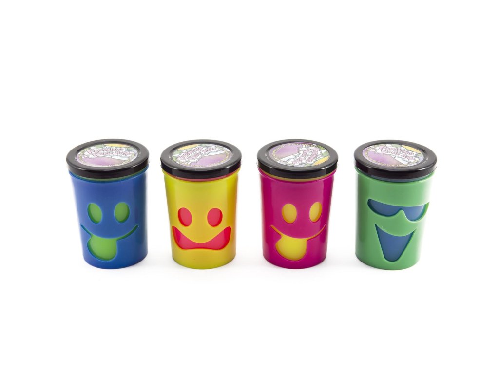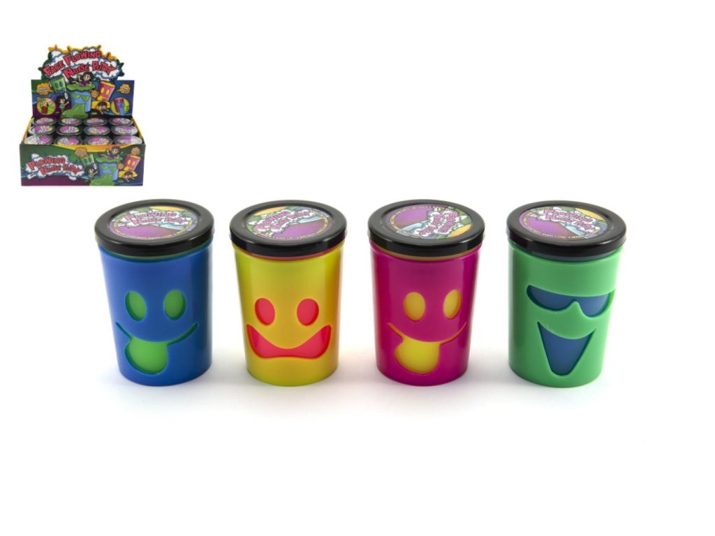 Sliz v kelímku s obličejem prdící. Kelímek můžete použít k legráckám se slizem. Zmáčkněte sliz v kelímku a proteče Vám otvory a navíc vydává vtipné zvuky.