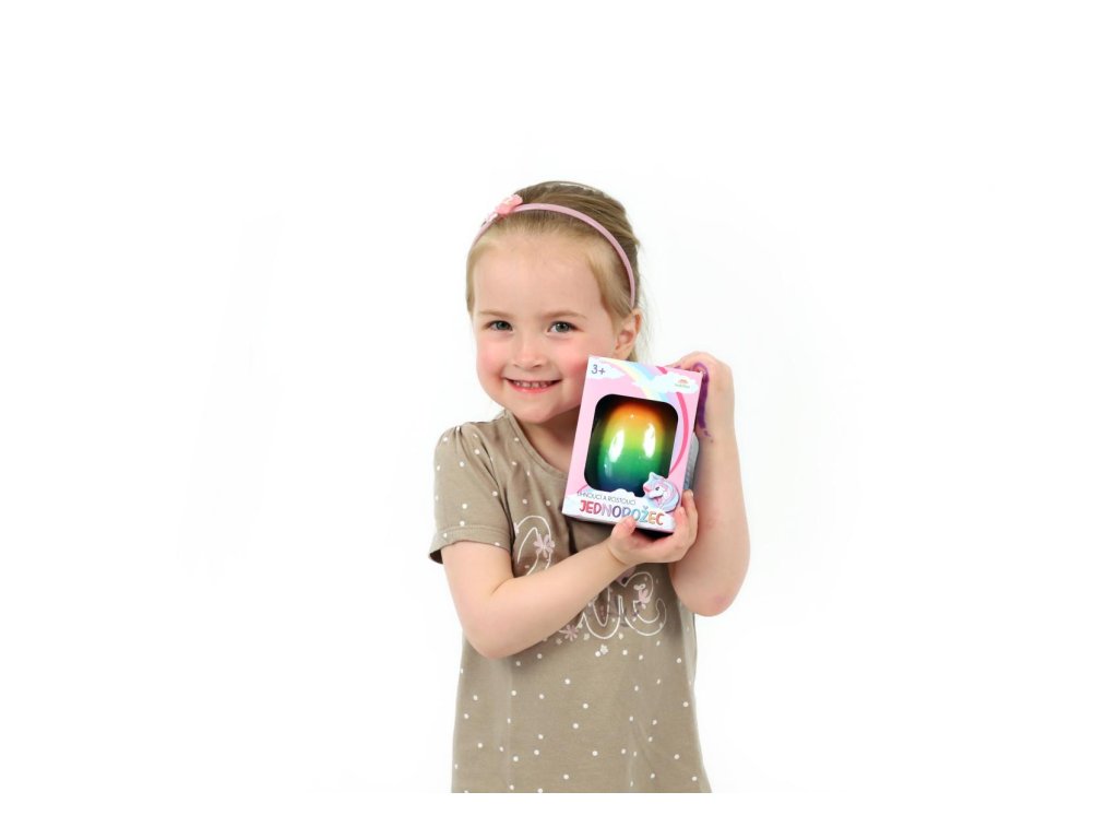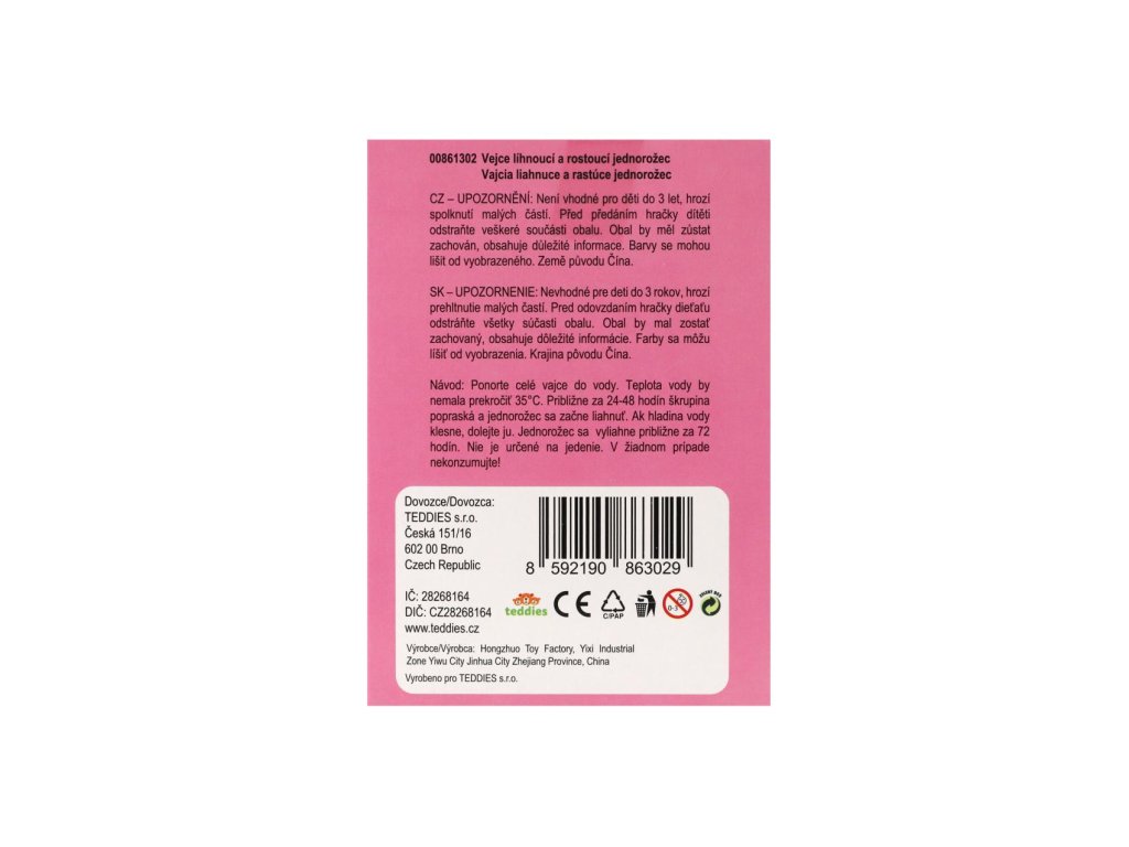 Ve vajíčku je ukryto překvapení ve formě jednorožce. Aby se ale z vajíčka vyklubal, stačí ponořit vajíčko do misky s vlažnou vodou. Přibližně za 24 - 48 hodin skořápka popraská a jednorožec se začne klubat. Děti tak mohou pozorovat, jak se jednorožec líhne z vajíčka. Jak bude vypadat se dozvědí za cca 72 hodin.Rozměr krabičky: 9,5 x 13 cm