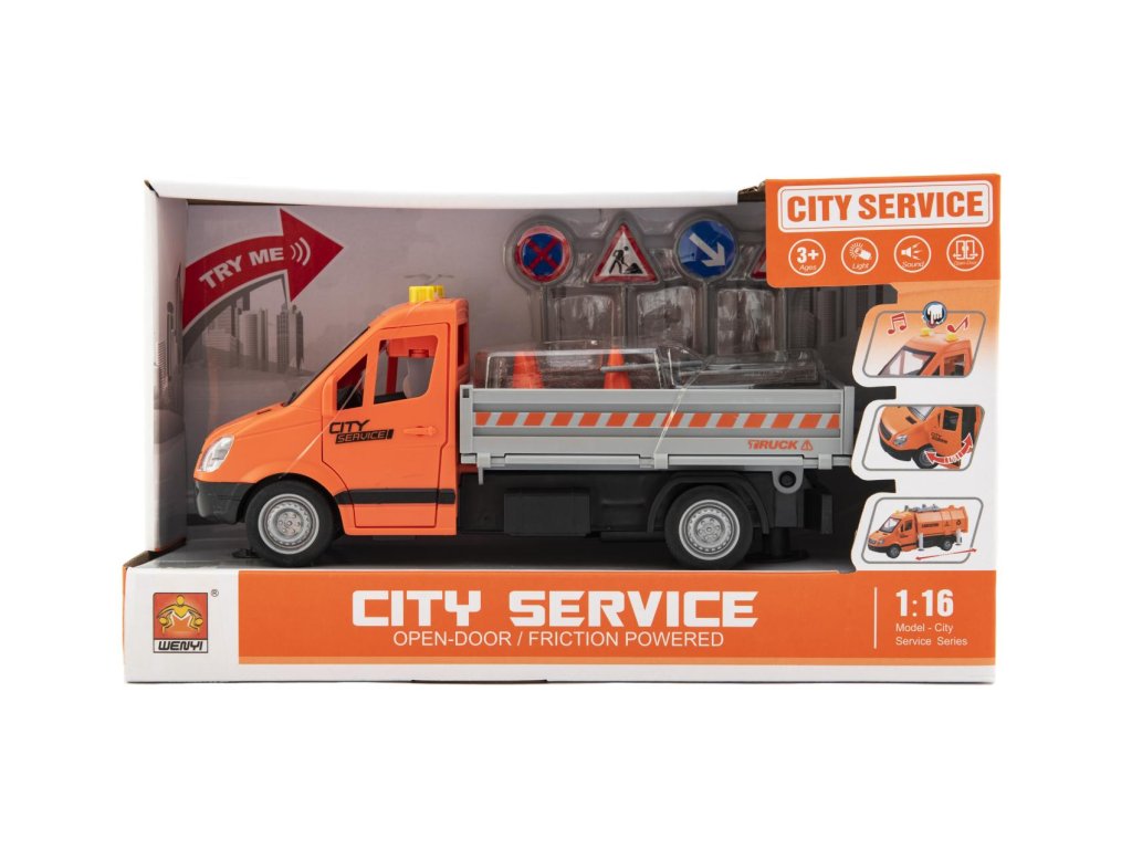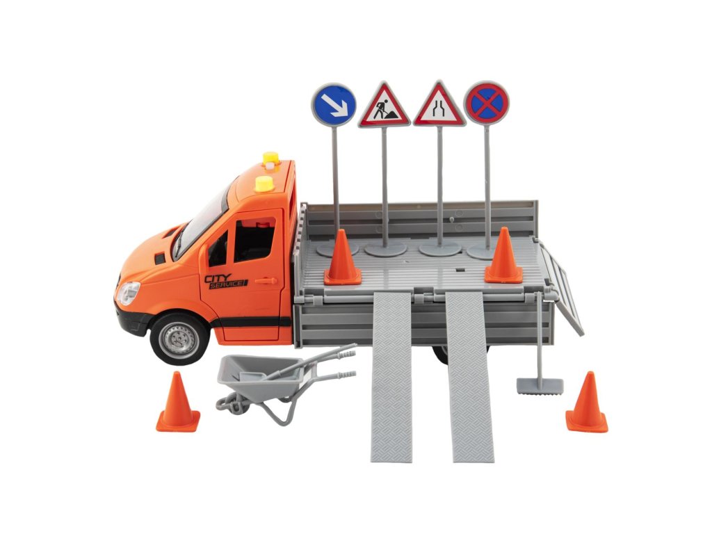Silničářské auto plné dopravních značek a pomůcek potřebných pro práci každého silničáře. Údržba silnic, chodníků a parků je důležitá v každé obci a městě. Auto je v měřítku 1:16, je na setrvačník, se světlem a se zvukem. Baterie 3x AG13 jsou součástí balení.Rozměry balení 32 x 19 x 12 cm.