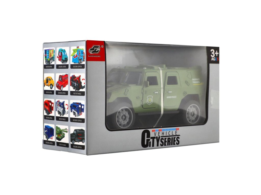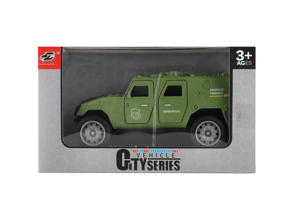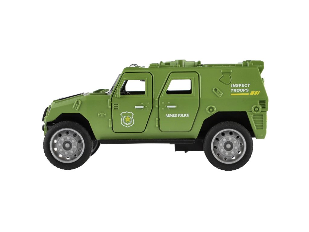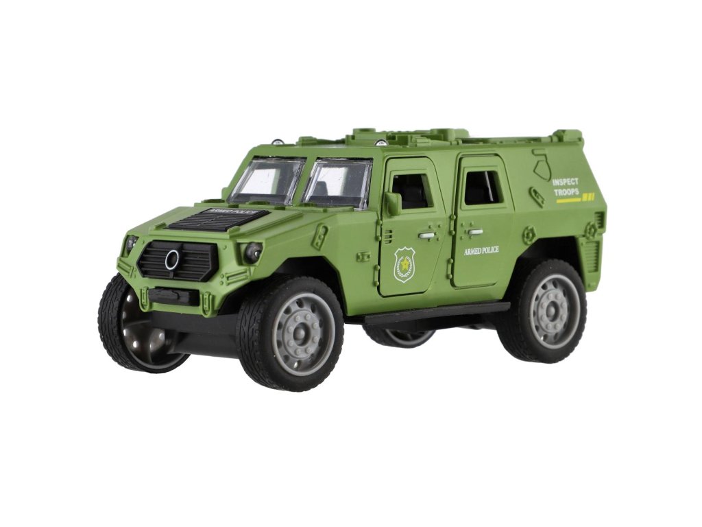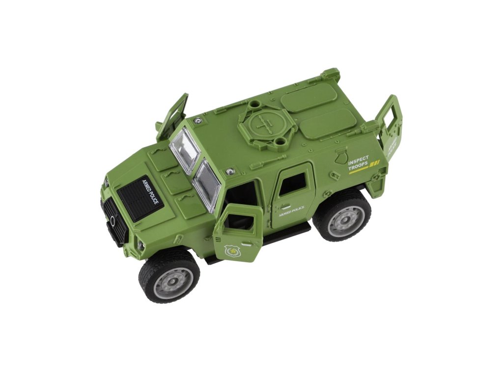 Vojenské auto o délce 13 cm je vyrobeno z odolného plastu a vybaveno mechanickým pohonem na setrvačník, který zajišťuje plynulý pohyb vpřed po natažení.Model v realistickém designu potěší všechny malé milovníky armádních vozidel a akčních scén.