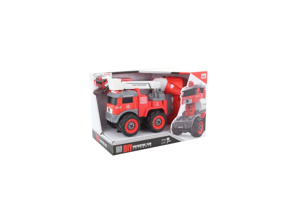 Šroubovací hasičské auto na dálkové ovládání. Auto lze sešroubovat pomocí přiloženého šroubováku nebo vrtačky. Z vrtačky lze vyndat motorek, který se vloží do auta a to poté jezdí pomocí ovládání dopředu a dozadu. Auto lze také transformovat na robota. Auto také vydává zvuky a svítí. Napájení na 4 AAA baterie (nejsou součástí) a na 3 LR41 baterie (jsou součástí). Rozměry auta cca 15 x 14 x 10 cm. Rozměry balení cca 26,5 x 17,5 x 14 cm. Věk 3+Doplňkové parametry