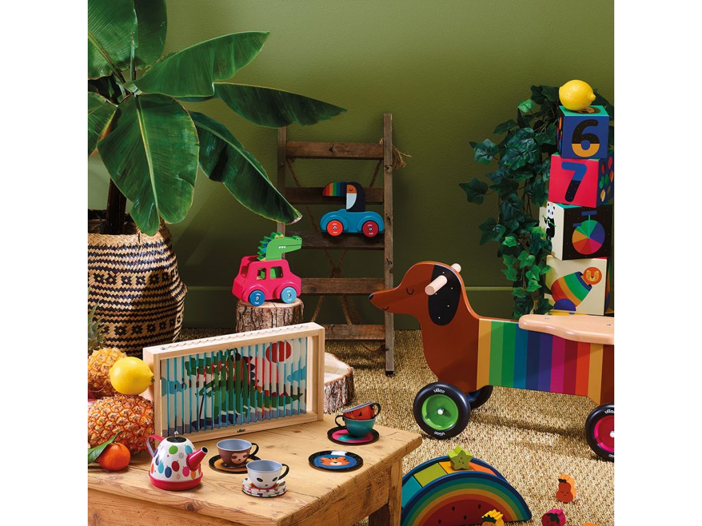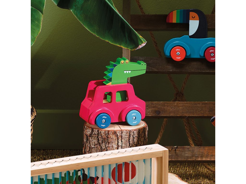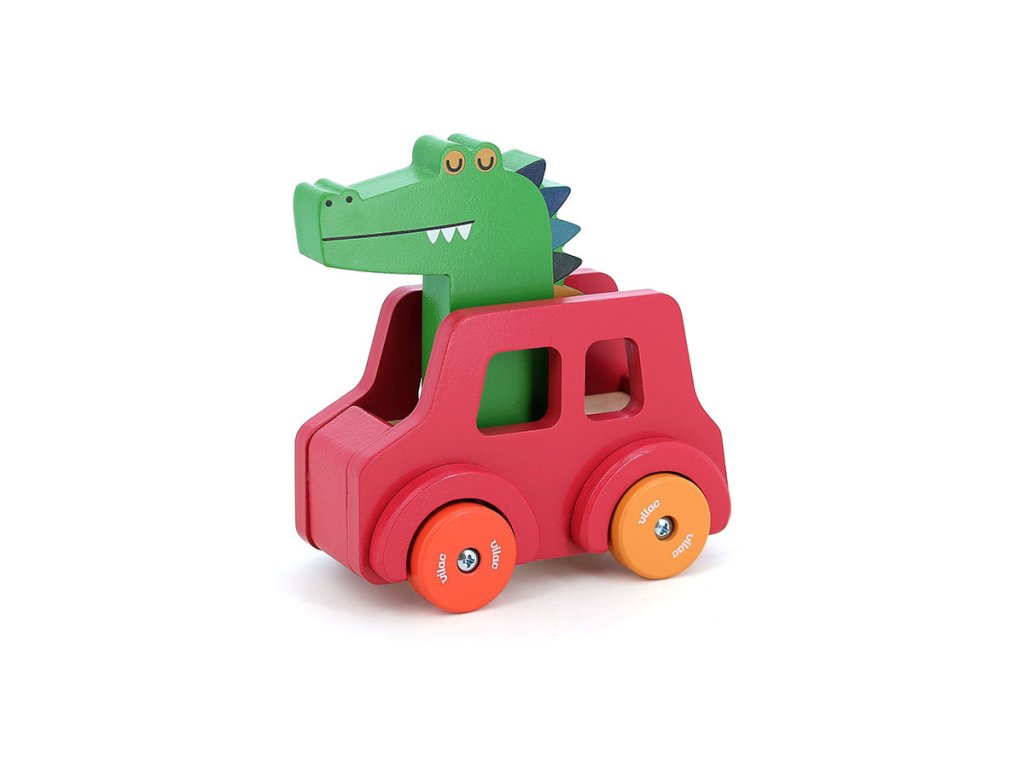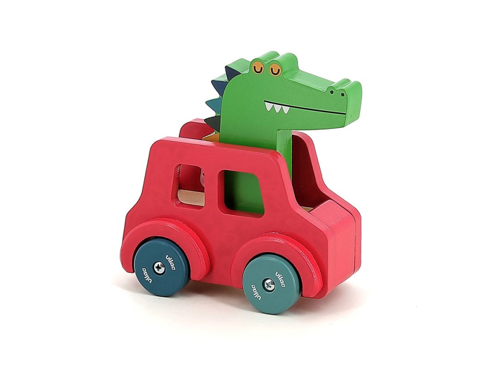 Dřevěné autíčko v červené barvě s barevnými koly, ve kterém sedí spokojený krokodýl. Pod krokodýlem je zabudován klakson, proto když dítko zatlačí na hlavu krokodýla, ozve se zatroubení. Tento zvukový detail stimuluje zájem batolat a zároveň jim poskytuje přímou interakci s hračkou. Hračka je dokonale přizpůsobena pro malé ruce a rozvíjí fantazii, jemnou motoriku a koordinaci ruka-oko.