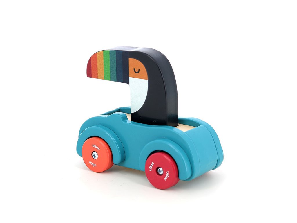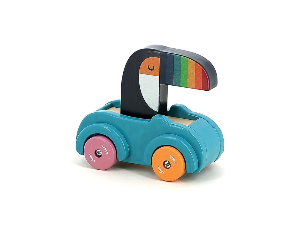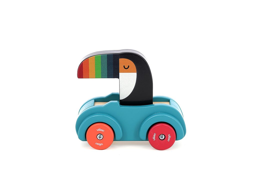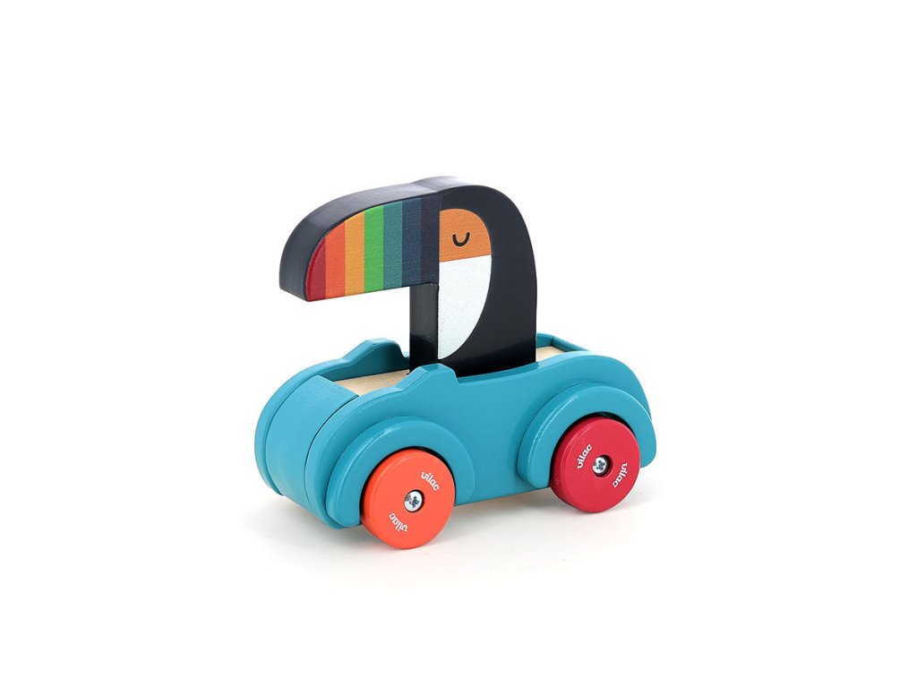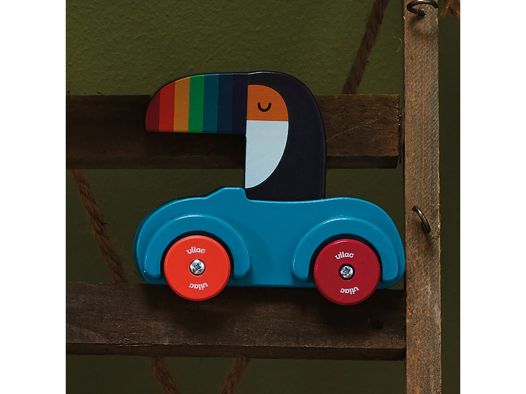 Dřevěné autíčko v modré barvě s barevnými koly, ve kterém sedí tukan s barevným zobákem. Pod tukanem je zabudován klakson, proto když dítko zatlačí na hlavu tukana, ozve se zatroubení. Tento zvukový detail stimuluje zájem batolat a zároveň jim poskytuje přímou interakci s hračkou. Hračka je dokonale přizpůsobena pro malé ruce a rozvíjí fantazii, jemnou motoriku a koordinaci ruka-oko.