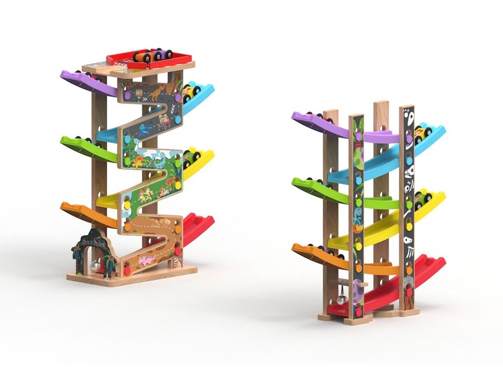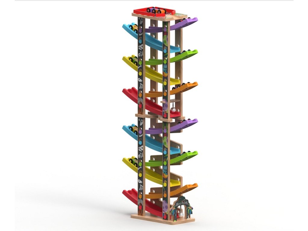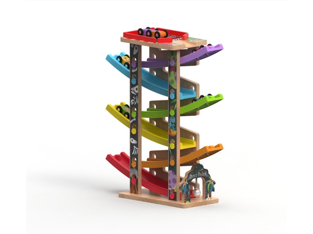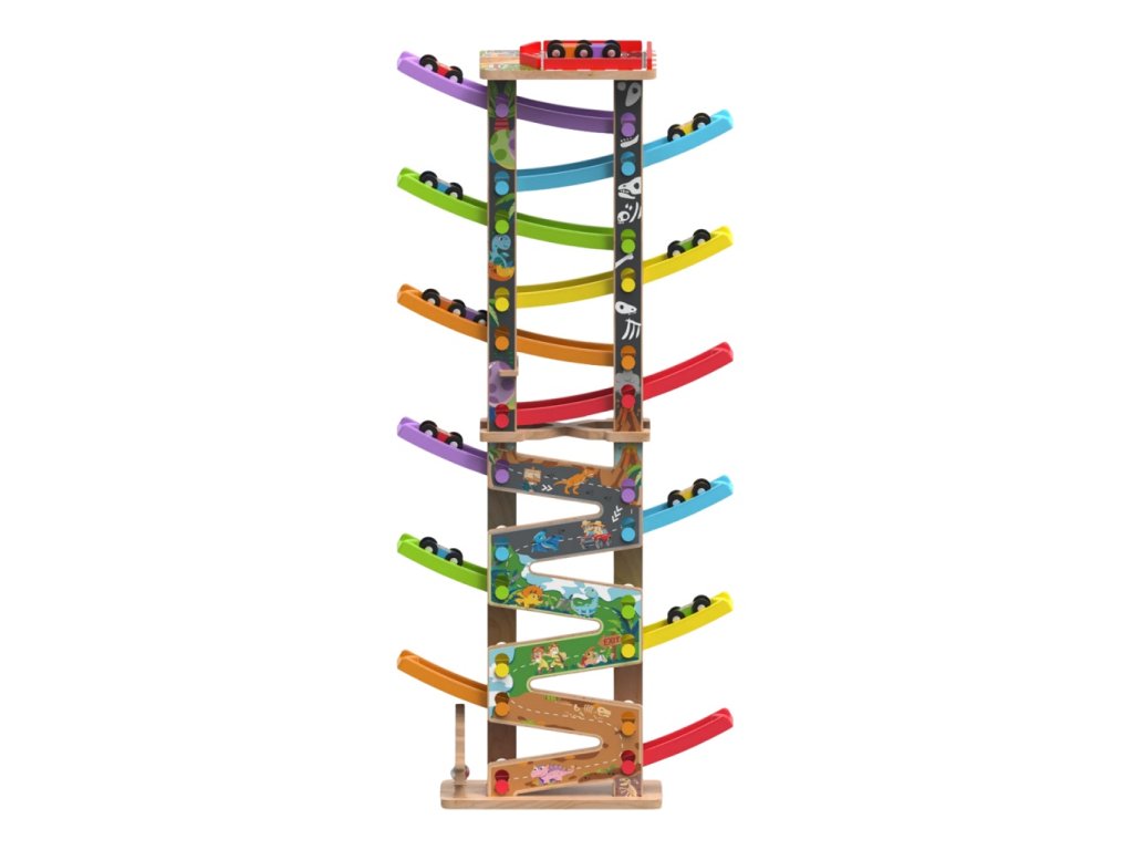 Velká dřevěná závodní dráha s 6 rampami přinese dětem spoustu zábavy a akce! Barevné autíčko vyjede na vrchol dráhy a pak sviští dolů po rampách, zatáčkách a mostech, zatímco děti sledují, jak rychle projede celou trať. Robustní dřevěné provedení je stabilní a bezpečné, ideální pro malé ruce. Sada obsahuje 18 dílů včetně několika autíček, takže si děti mohou hned začít hrát. Dráha podporuje rozvoj jemné motoriky, koordinaci ruka-oko, vnímání prostoru a rozvíjí logické myšlení. Hračka je vhodná pro děti od 18 měsíců, která zabaví na dlouhé hodiny — a to nejen jednoho malého závodníka, ale klidně i celou rodinu.