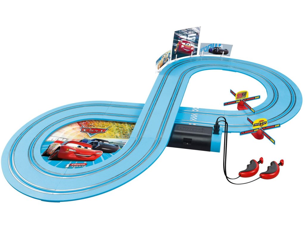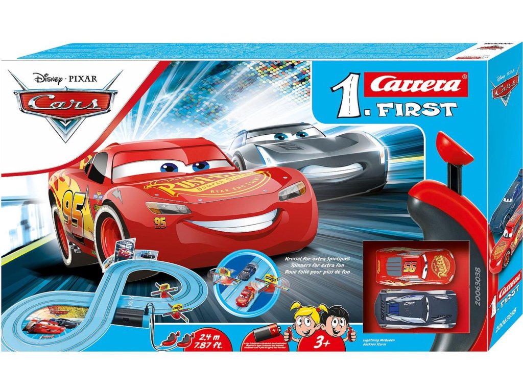 Autodráha Carrera FIRST dlouhá 2,4m s auty Blesk McQueen a Jackson Storm z filmu CARS, pro děti od 3 let, na baterie, obsahuje rovinky, zatáčky, točíčí bránu, ovladače a dekorace s tématikou CARS.Délka trati: 2,4m