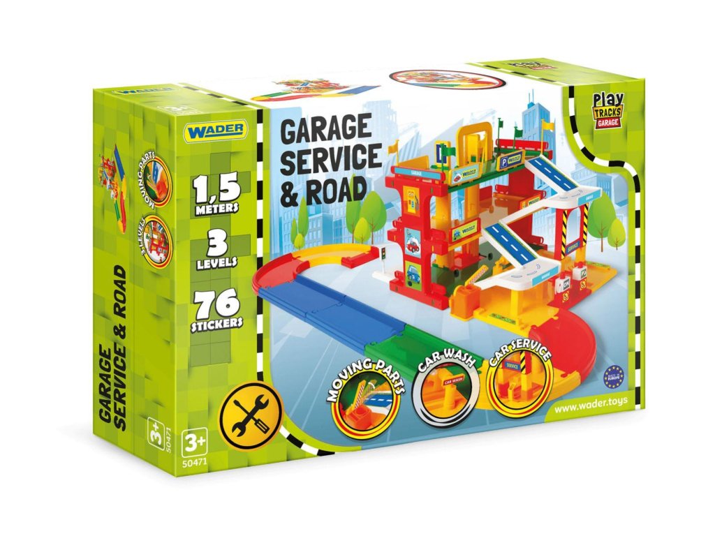 Garáž servis 3 patra + dráha 1,5m + 2 auta plast v krabici 59x40x15cm Wader