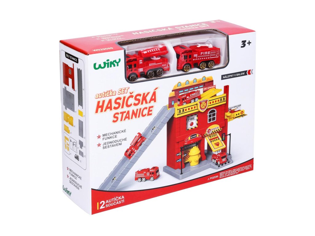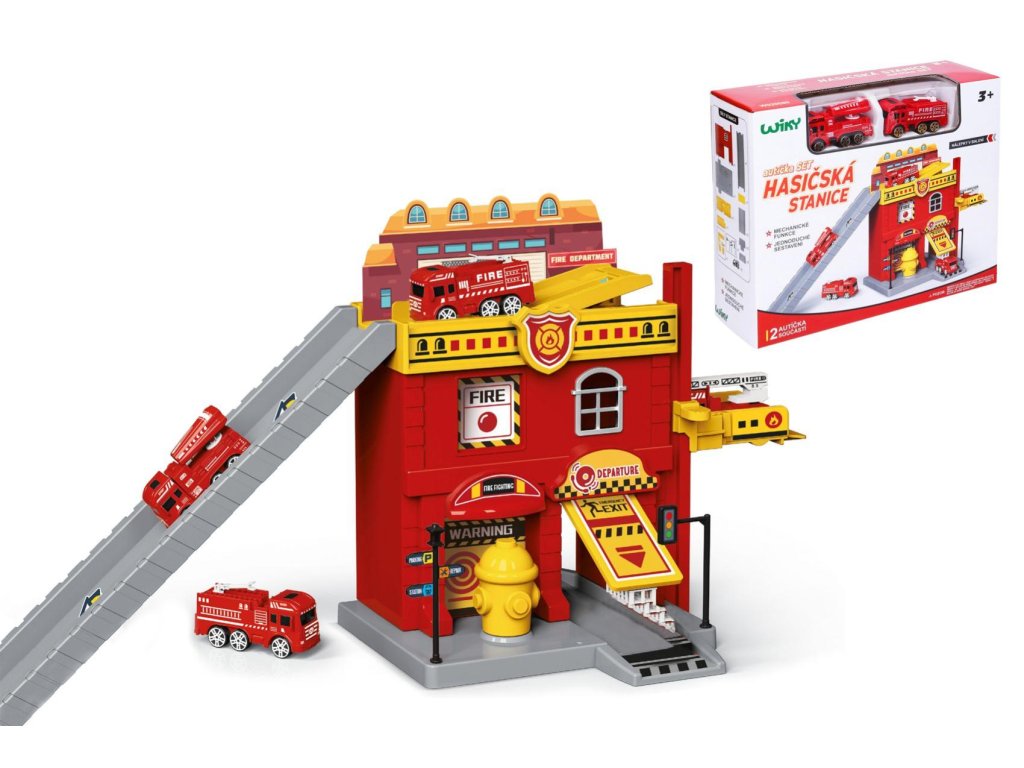 Hasičská stanice. Rozměry 37x17,5x21 cm. Součástí dvě auta. Volná kola. Manuální výtah, otevírací dveře. Nálepky a obrázkový návod na složení součástí balení.Doplňkové parametry