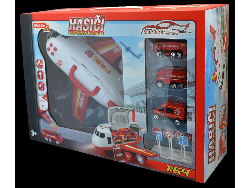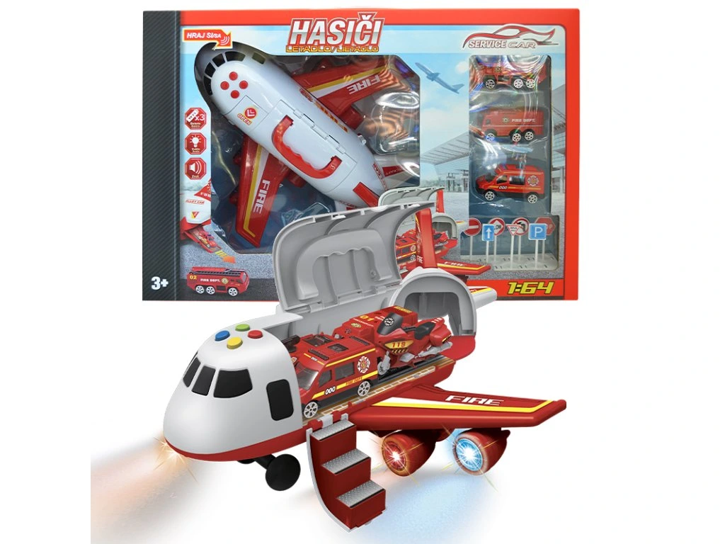 - GARÁŽ/LETADLO HASIČI – s příslušenstvím (sada) - Rozměr garáže po rozložení: 25x28x30cm, tlačítka pro zvukové a světelné efekty, jízda na setrvačník - Obsah sady: hasičské letadlo/garáž 2v1 (funkce přeměny z letadla na garáž a zpět) a kovový model autíčka 1:64 (3 ks) Výrobek na baterie :Použijte 3x baterie "AA" 1,5V (nejsou součástí balení).3+Doplňkové parametry