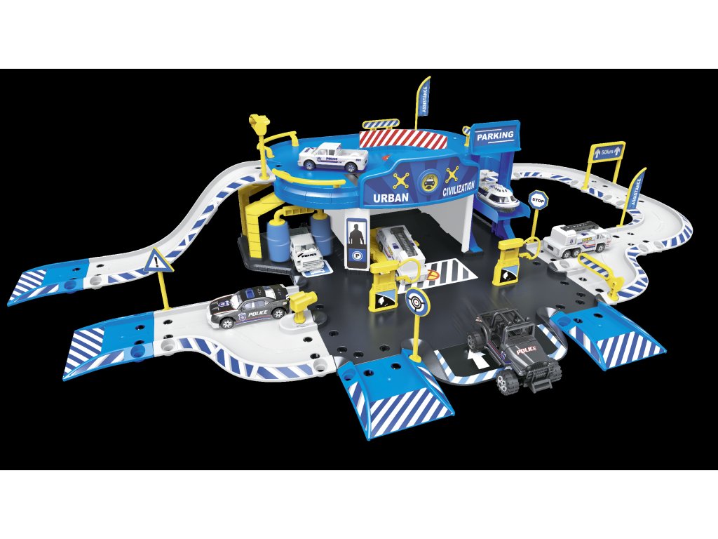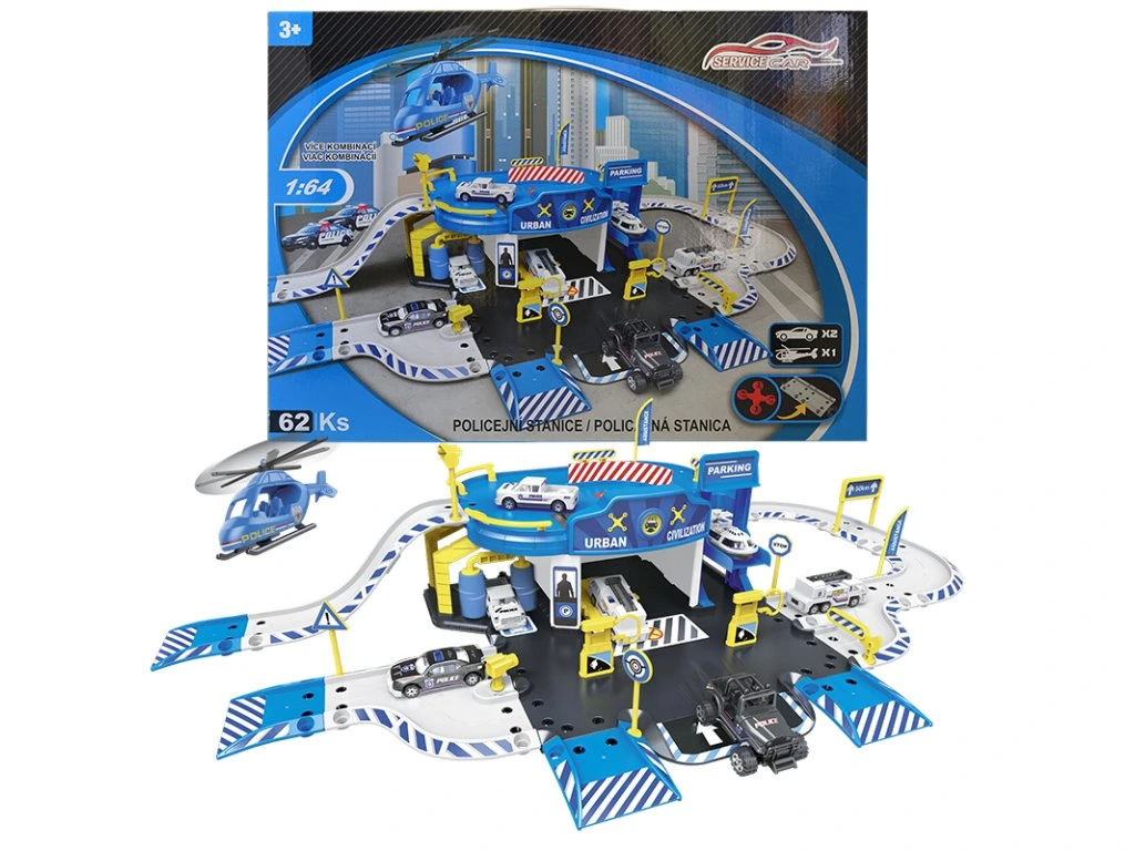 GARÁŽ/STANICE POLICIE s příslušenstvím (sada 62 ks) - Rozměr garáže po rozložení: 83,2x45,2x20cm - Obsah sady: policejní stanice s garáží, 2x model autíčka 1:64 (kovový) a 1x vrtulník - Nevhodné pro děti do 3 let.Doplňkové parametry