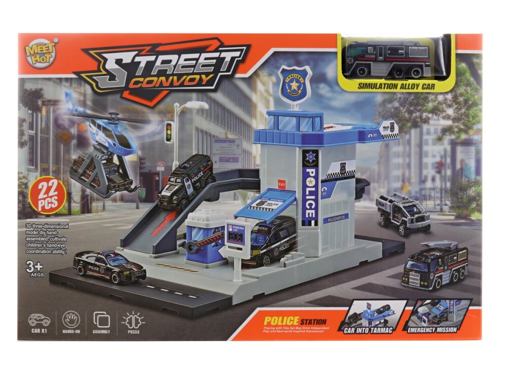 Rozkládací policejní stanice. Sada obsahuje celkem 22 dílků včetně 1 policejního auta. Materiál plast. Baleno v krabici. Rozměry balení 36x24x7 cm. Velikost autíčka 7 cm. Věk 3+Doplňkové parametry