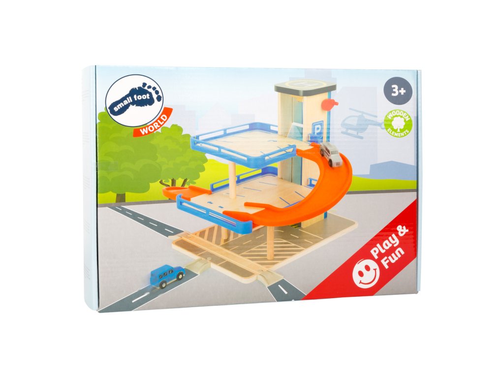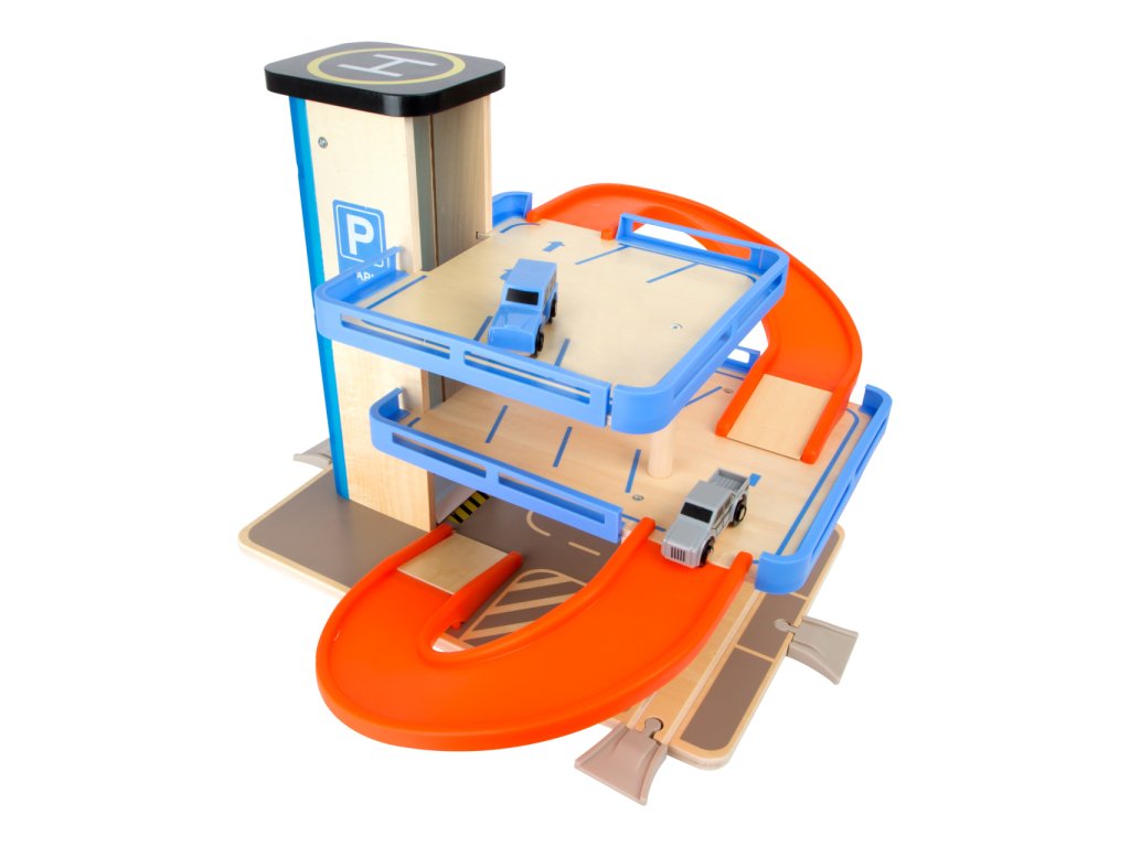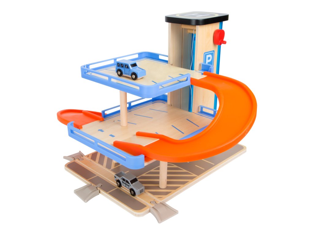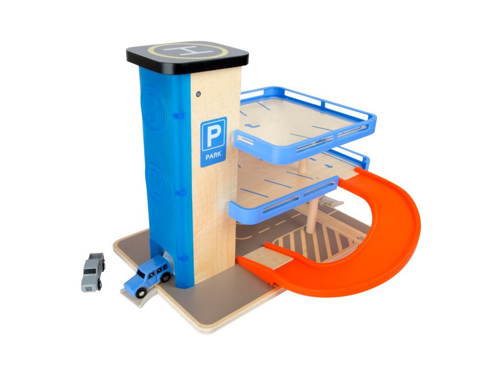 Prostorná garáž v atraktivních barvách nabízí tři podlaží propojená výtahem a na sebe plynule navazujícími rampami. Součástí balení je dvojice autíček, a děti si tak mohou hrát bezprostředně po sestavení. Základní díly ze silné překližky a masivního dřeva doplňují robustní plastové prvky, hračka je proto zvláště odolná a nabízí dlouhou životnost. Lze ji rozšířit množstvím příslušenství a je také plně kompatibilní s vláčkodráhami jiných velkých výrobců. Výrobek vyžaduje montáž, dodáváno s obrázkovým návodem k sestavení. Hlavní vlastnosti:garáž a 2 autíčka3 podlaží, 2 rampy a funkční výtahrobustní a odolné provedeníkompatibilní i s vláčkodráhami dalších výrobcůDoplňkové parametry