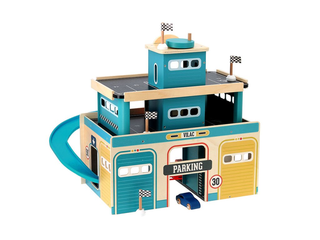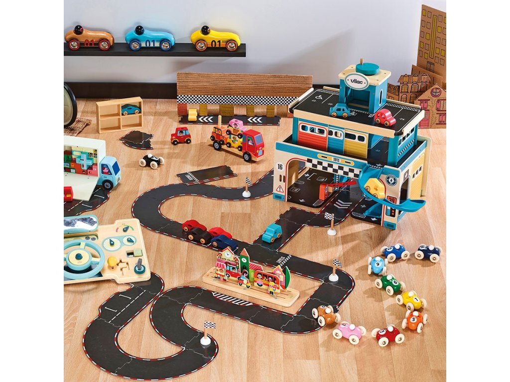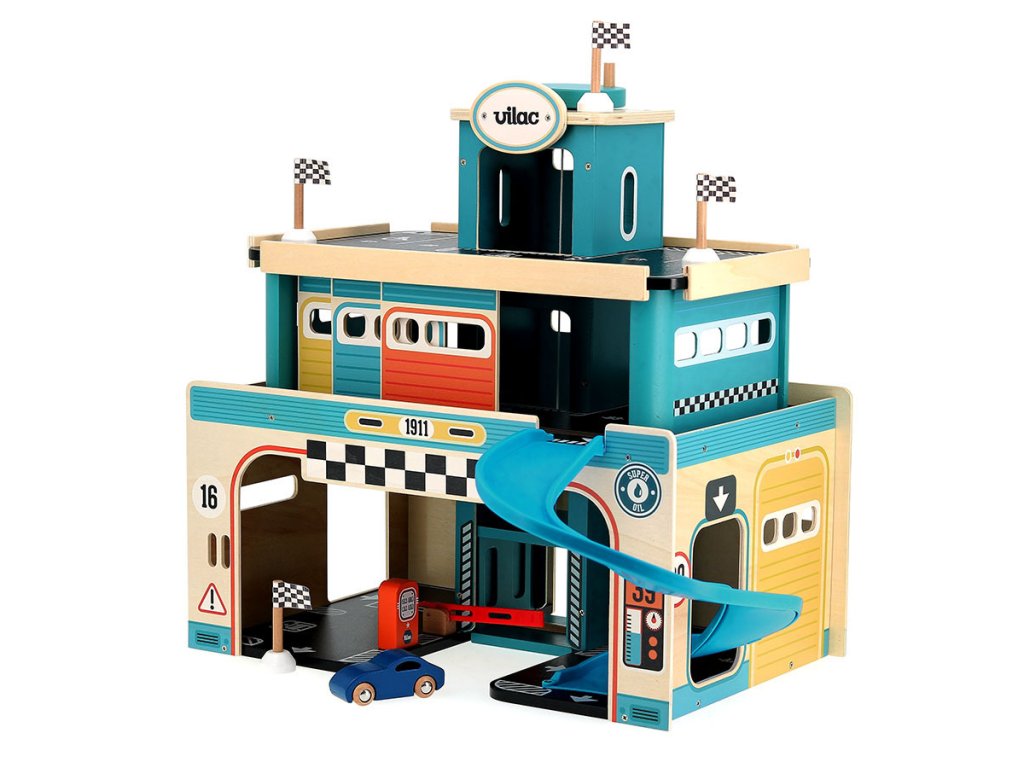 Dřevěná garáž ve vintage stylu je snem všech malých řidičů a řidiček. Díky posuvným dveřím, výtahu pro autíčka a spirálové dráze zve ke hře plné představivosti a dobrodružství. Děti mohou svá vozidla parkovat, opravovat nebo posílat do akce po rychlé točité dráze. Garáž je skvělým společníkem při hrách na „dospělé“, kdy dítě napodobuje každodenní situace a rozvíjí tím nejen fantazii, ale i jemnou motoriku, koordinaci a schopnost spolupráce. Díky robustnímu provedení a univerzálnímu designu je garáž kompatibilní s většinou běžných kovových autíček a je kompatibilní s hračkami řady Vilacity. Hra, která roste s dítětem a nikdy neomrzí!