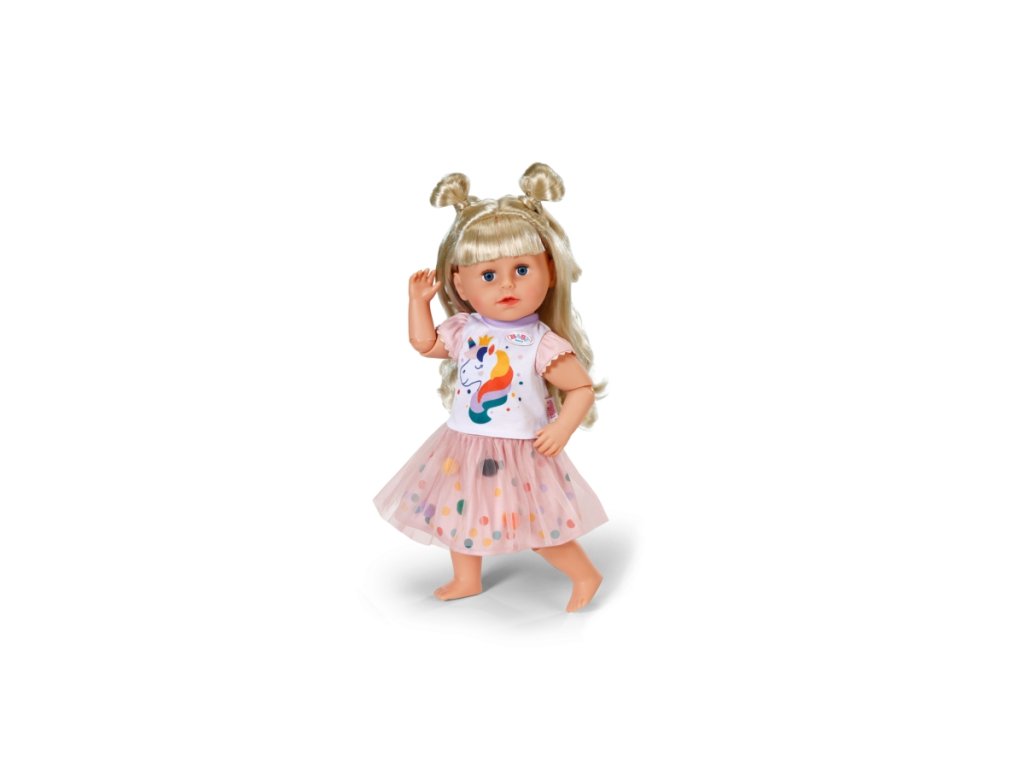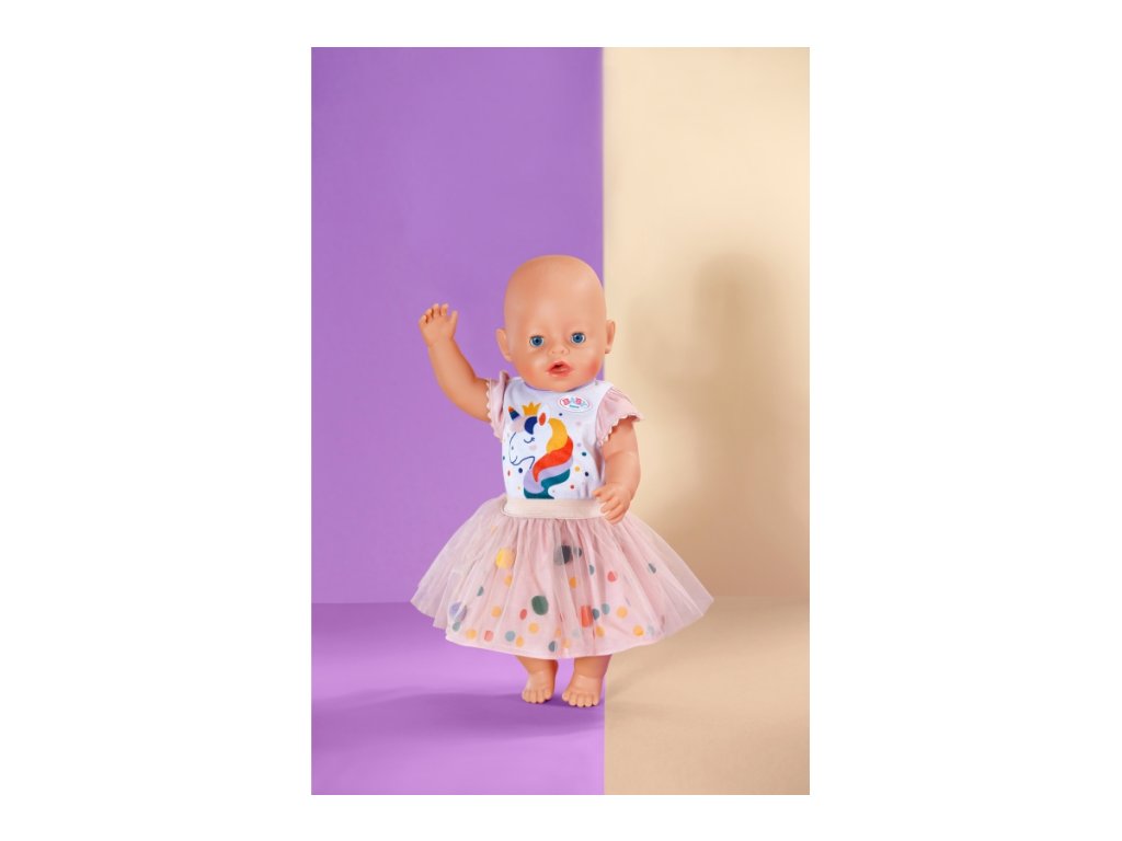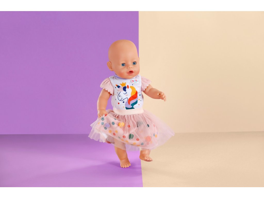 Krásný obleček pro vaši panenku BABY born. Velikost oblečení 43 cm. Světlý 2dílný set (triko s motivem jednorožce a tutu sukně s bambulkami). Věk 3+Doplňkové parametry