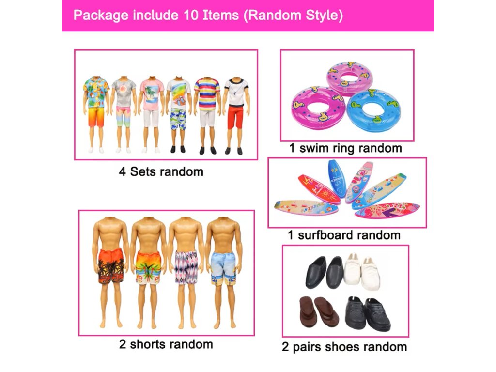 10dílná sada plážového oblečení a doplňků pro panenku Kena