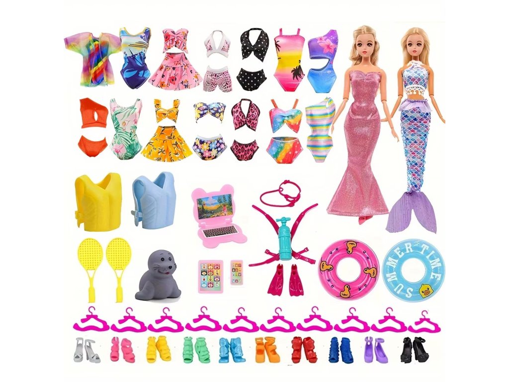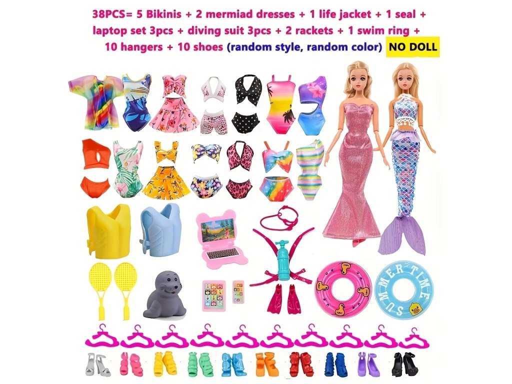38 ks sada oblečků a doplňků pro Barbie panenku plavání a prázdniny