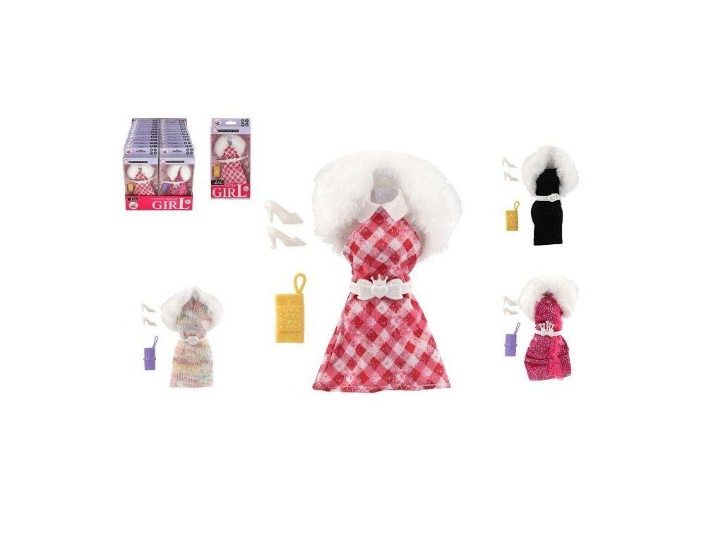 Šaty/Oblečky s doplňky na panenky mix druhů v krabičce 11x23 cm