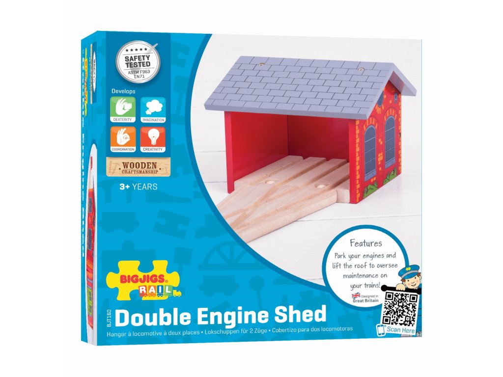 Dřevěné železniční depo pro 2 vláčky včetně vjezdové koleje.Kompaktní a dobře navržené depo má schopnost uložit až 2 vlaky. Skvělý doplněk dřevěné vláčkodráhy pokud máte v daném okamžiku přebytek vašich vláčků nebo pokud je jen potřebujete nechat odpočinout nebo natankovat.Hlavní vlastnosti: vláčkodráhy a jejich příslušenství značky Bigjigs Rail je možno kombinovat se všemi dalšími dřevěnými vláčkodráhami na trhuvyrobeno z kvalitních a zodpovědně získaných přírodních materiálůodpovídá současným evropským bezpečnostním normámpodporuje představivost, obratnost a koordinaciDoplňkové parametry