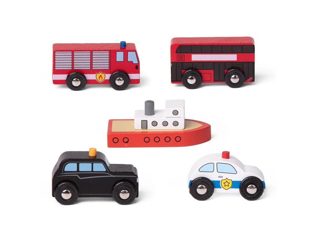 Je čas se zaměstnat a přidat do rozvržení tratě další provoz! Černý taxík, červený dvoupatrový autobus, hasičský vůz, policejní auto a loď tvoří tuto flotilu městských vozidel. Nekonečné hodiny kreativní zábavy.Součástí balení je vše dle obrázku. Hlavní vlastnosti: Vláčkodráhy a jejich příslušenství značky Bigjigs Rail je možno kombinovat se všemi dalšími dřevěnými vláčkodráhami na trhu.Vyrobeno z kvalitních a zodpovědně získaných přírodních materiálů.Odpovídá současným evropským bezpečnostním normám.Podporuje představivost, obratnost a koordinaci.Doplňkové parametry