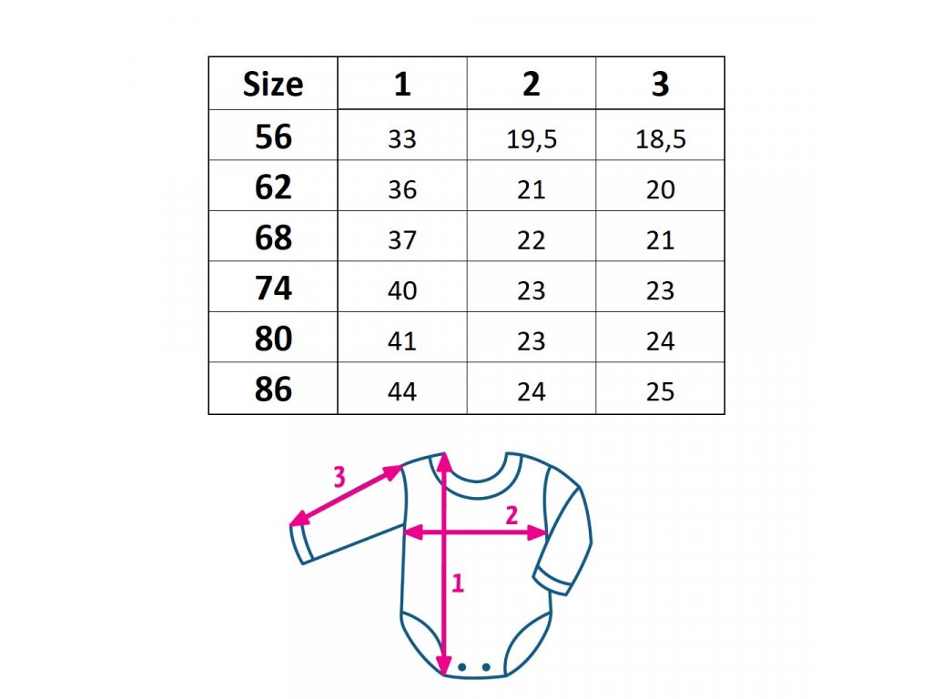 Velikosti: 50 (novorozenec), 56 (0-3 měsíce), 62 (3-6 měsíců), 68 (4-6 měsíců)