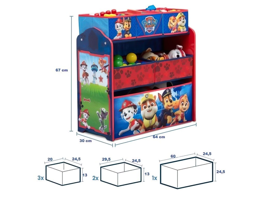 Praktický organizér na hračky s oblíbenou Tlapkovou patrolou do každého pokojíčku. Nudné uklízení hraček se může stát zábavou. Organizér je ideální k uskladnění hraček a knížek, obsahuje 6 plátěných boxů, řešených tak, aby si děti mohly ukládat hračky samy. Součástí balení jsou samolepeky, které umožňují rozvíjet fantazii a samostatně ozdobit boky organizéru. Vhodný pro děti od 3 let. Vlastnosti velmi silná a stabilní konstrukce snadno sestavitelný zaoblené rohy (větší bezpečnost dětí) Materiál kvalitní MDF deska plátěné boxy - 6ks Rozměry organizér 64 x 30 x 67 cmUpozornění !