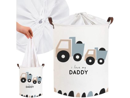 Koš na hračky, uzavíratelný, Tulimi, bavlna, Trucks Love Daddy - bílý, 43 L