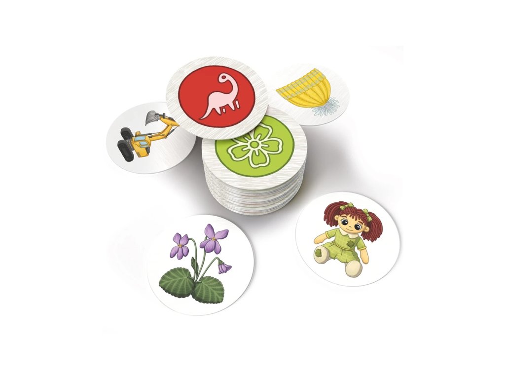Kdo najde správnou kartu jako první? Čepice, panenka, fialka bagr… Je něco z toho kytička? Rychlá zábavná postřehová hra, která rozvíjí slovní zásobu a podporuje schopnost zařadit obrázky do skupin. Zároveň cvičí rychlé reakce. Česká hra od českých autorů a ilustrátorů.