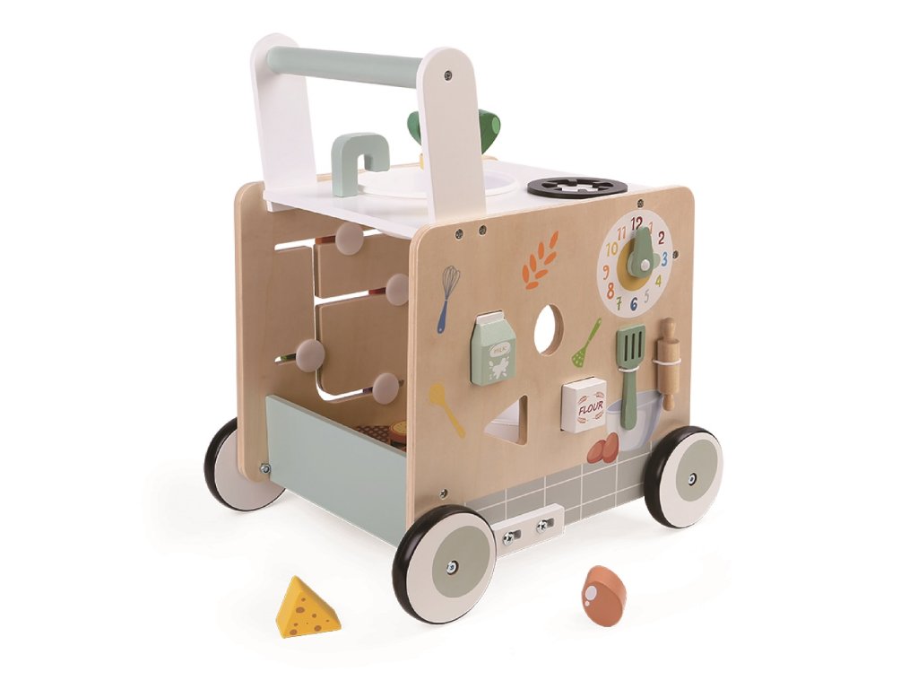 Dřevěné chodítko od 2Kids Toys je hravý pomocník pro první krůčky i kulinářské dobrodružství! Objevte kouzelné spojení kuchyňky a chodítka v jednom! Tento multifunkční dřevěný pomocník nejen podpoří Vaše dítě při jeho prvních krocích, ale zároveň rozvine jeho fantazii a jemnou motoriku. Ideální hračka pro malé kuchařky a kuchaře, kteří právě objevují svět! Chodítko nabízí také úložný prostor na hračky nebo kuchyňské náčiní. Navíc otočné knoflíky na troubě vydávají cvakavý zvuk! Na čtyřech stranách chodítka naleznete hry jako vkládání tvarů (potravin), otáčení ozubených koleček, zeleninový labyrint, troubu s plotýnkou nebo dřez s baterií. Chodítko má pogumovaná kola a je tak tiché a zároveň bezpečné. Dvířka trouby jsou otevíratelné. Robustní konstrukce ze dřeva se stabilním rámem zajišťuje bezpečnost při chození a dlouhou životnost.