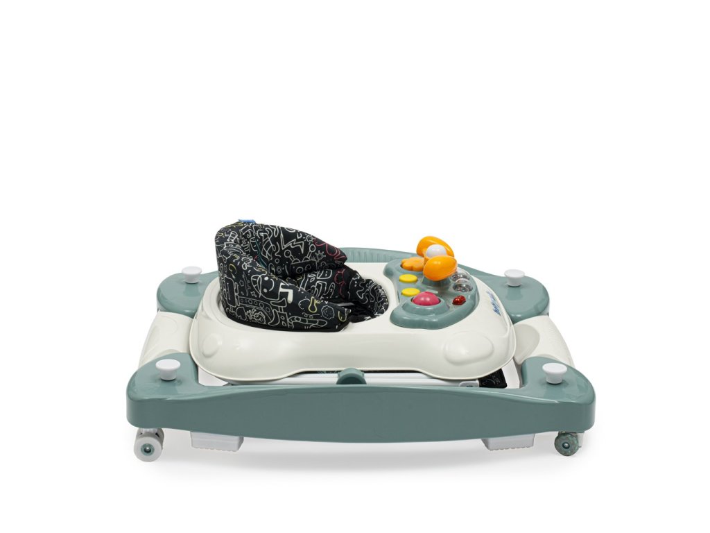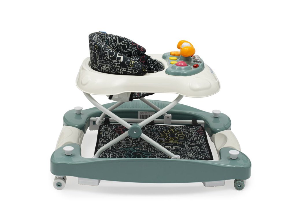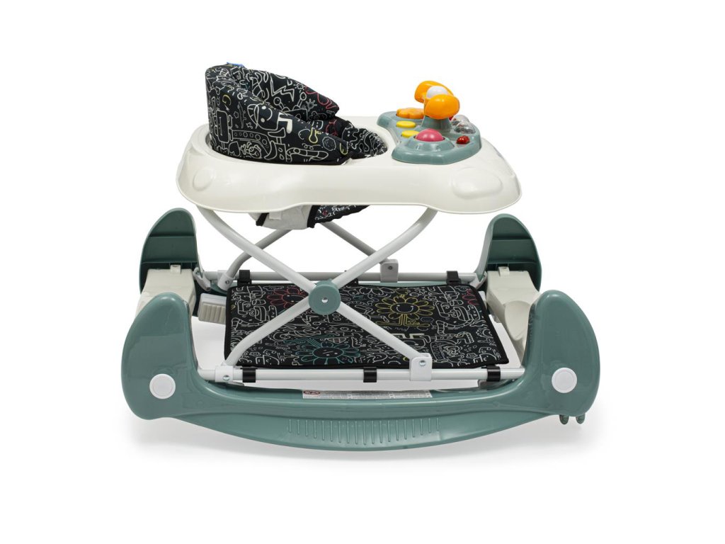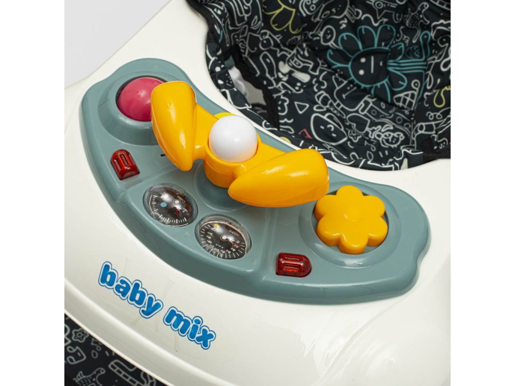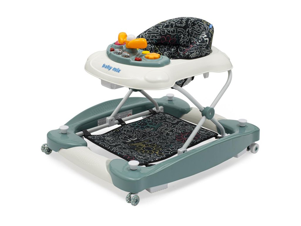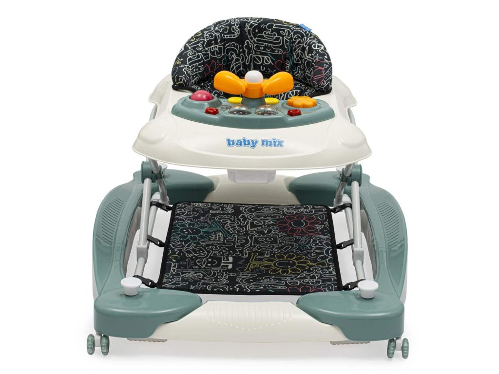 Dětské chodítko s houpačkou Baby Mix ve veselých barvách se čtyřmi silikonovými kolečky. Chodítko je nastavitelné do několika poloh a má velice pohodlný potah, který lze vyprat a je v zadní části vyztužený. Hrací pultík je vybaven volantem, který píská a lze ním otáčet, květinka, hrkálka, dvě tlačítka, které hrají melodie a dvě světýlka. Chodítko lze velmi jednoduchým způsobem změnit na houpačku. Vyrobeno z kvalitního plastového materiálu. Rozměry cca 75x70 cm. Baterie nejsou součástí balení. Nosnost do cca 12 kg.Doplňkové parametry